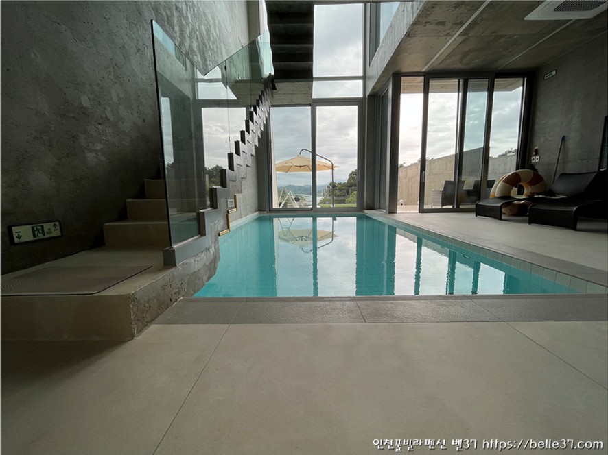 연천 풀빌라펜션 벨37 2층 객실에서 실내 계단을 따라 내려가면 수영장이 있는 1층 객실가 만납니다.