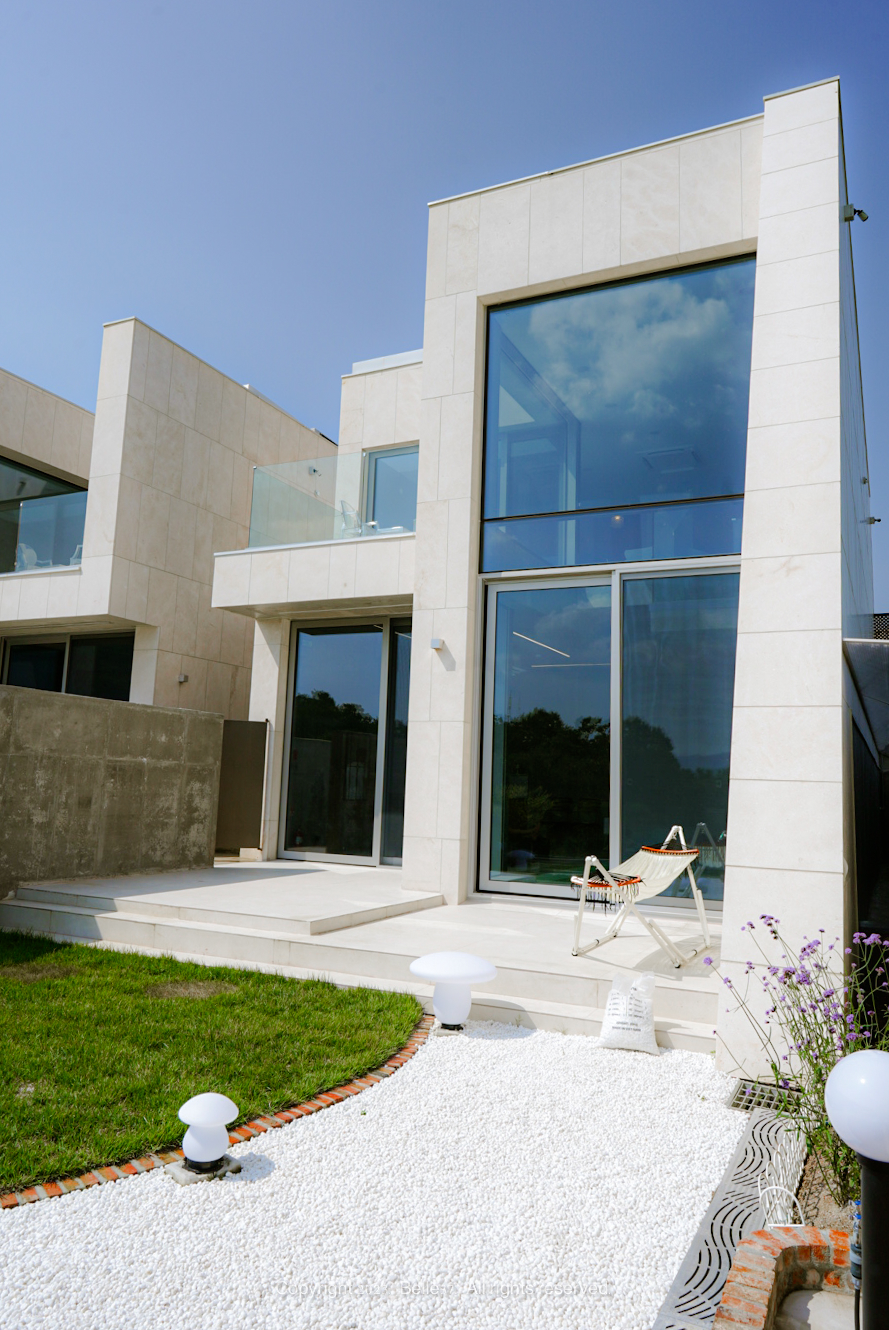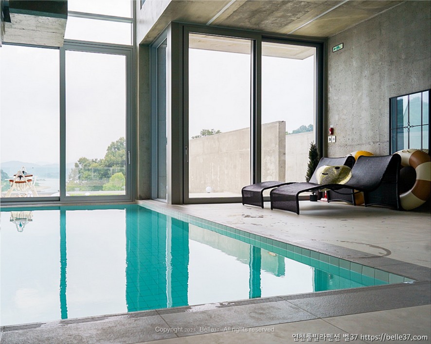 연천 풀빌라펜션 벨37은 프라이빗한 4계절 실내 온수수영장과 개방감 있는 정원이 연계되는 구조의 감성있는 신축 독채풀빌라입니다.