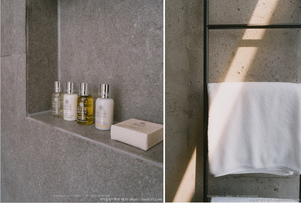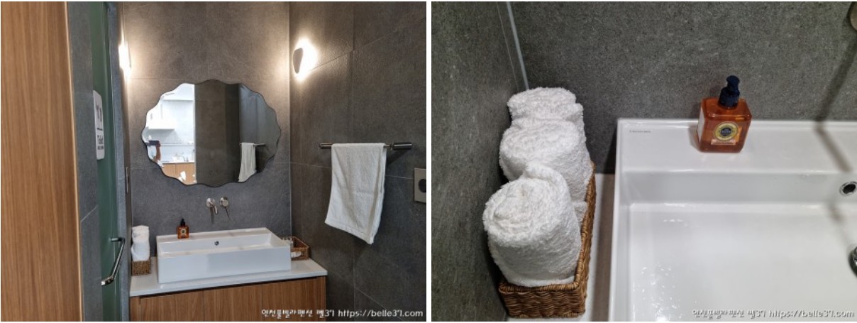 고급호텔급 페이스타올과 록시땅 세정제, 몰튼 브라운 바디워시, 샴푸, 린스, 바디로션, 비누셋트가 구비되어 있으며