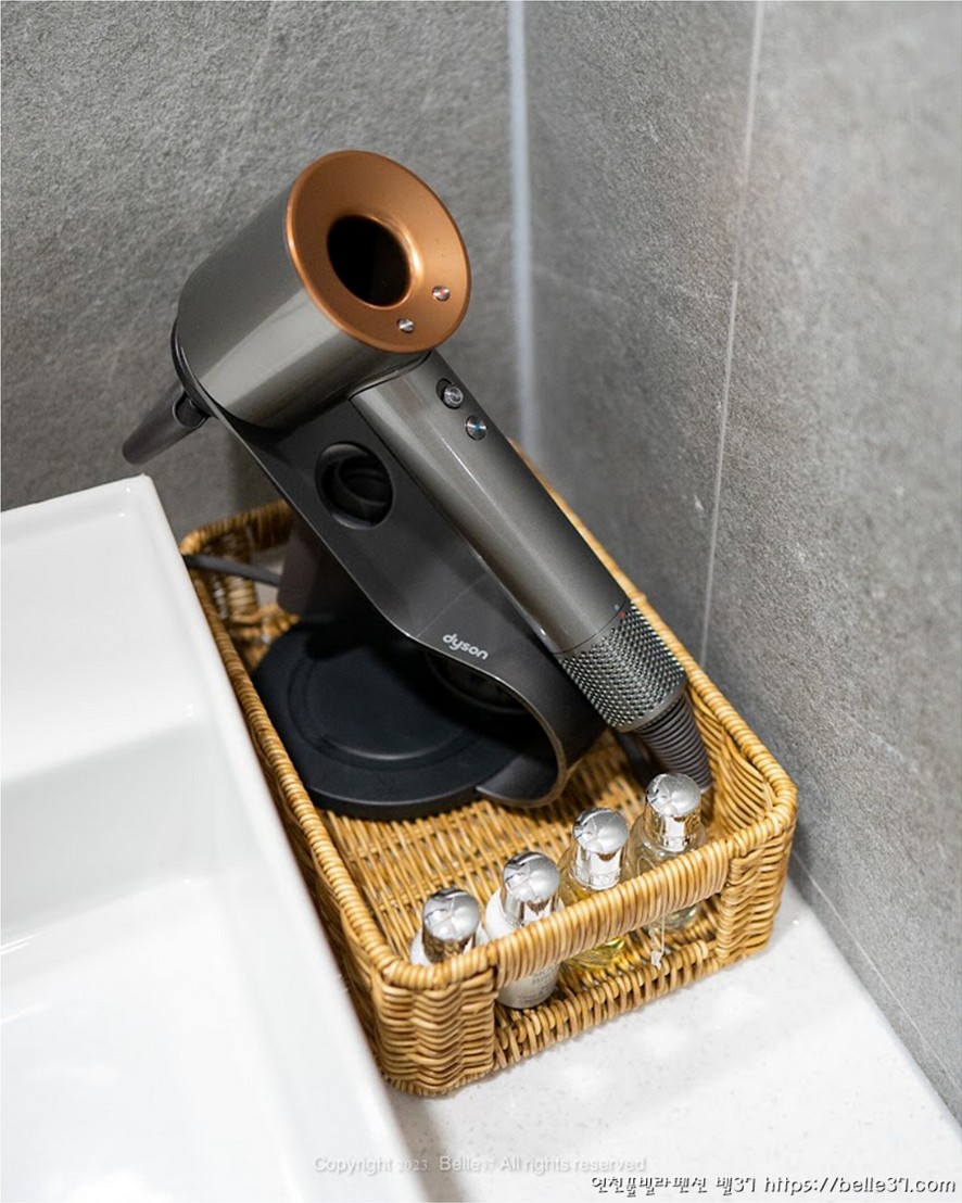 알로 치약, 칫솔 세트와 머리빗과 끈, 그리고 다이슨 헤어드라이기가 비치되어 있어 편의성을 극대화 시켰습니다.
