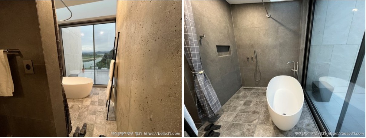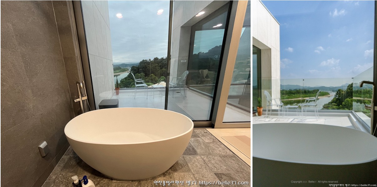 프라이빗하면서도 개방감 있는 욕실에서 샤워를 하거나 목욕을 하면서도 멋진 임진강 리버뷰를 실시간으로 감상하실 수 있어요~