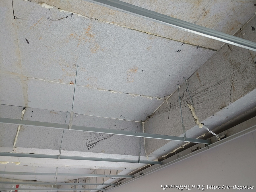 최상층 천정의 경우 천정부위에 단열재가 선시공 되어있거나 후시공하는 경우가 있는데 본 현장의 경우 단열재를 선시공한 사례입니다. 단열재를 선시공하든 후시공하든 단열재간 틈새가 발생하게 되는데요.. 천정 석고보드 작업전에 단열재의 틈새를 우레탄폼등을 이용하여 기밀하게 막아주어야 열교현상을 방지 할 수 있습니다.