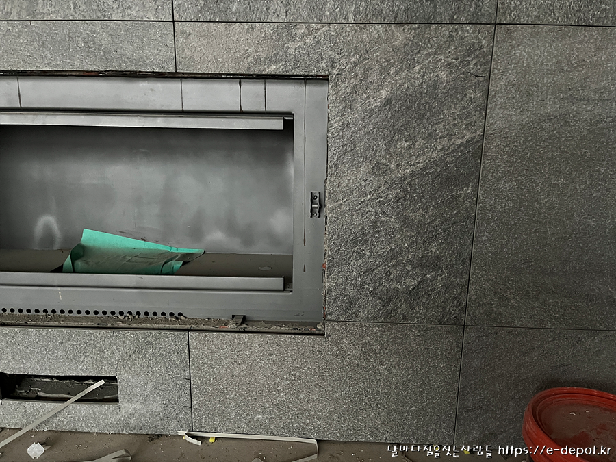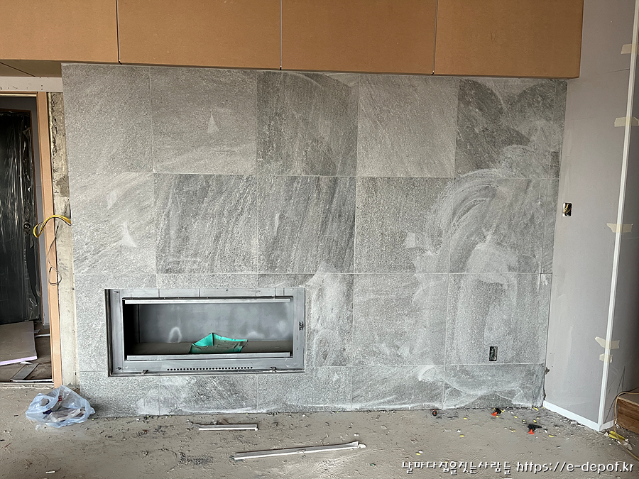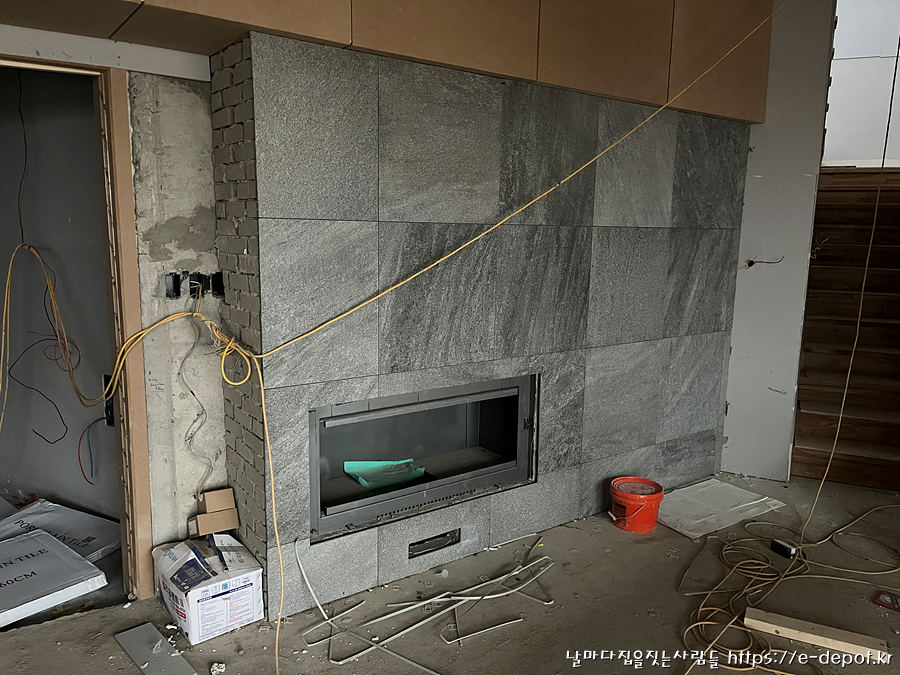 벽난로 설치 부위에 포세린 타일을 시공
