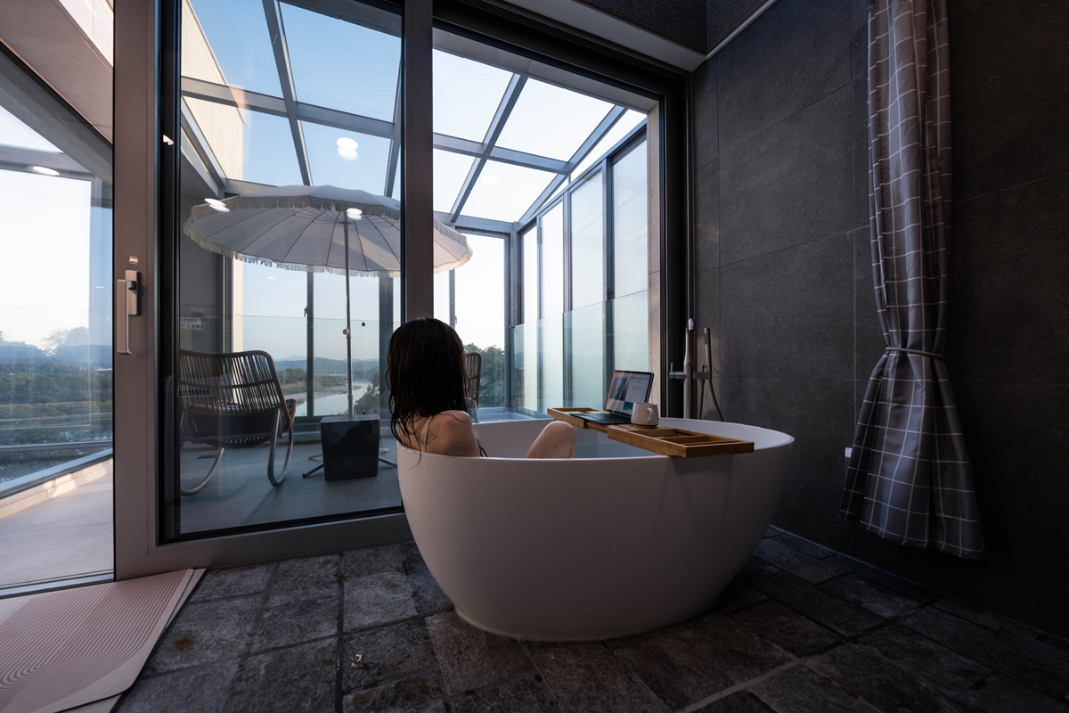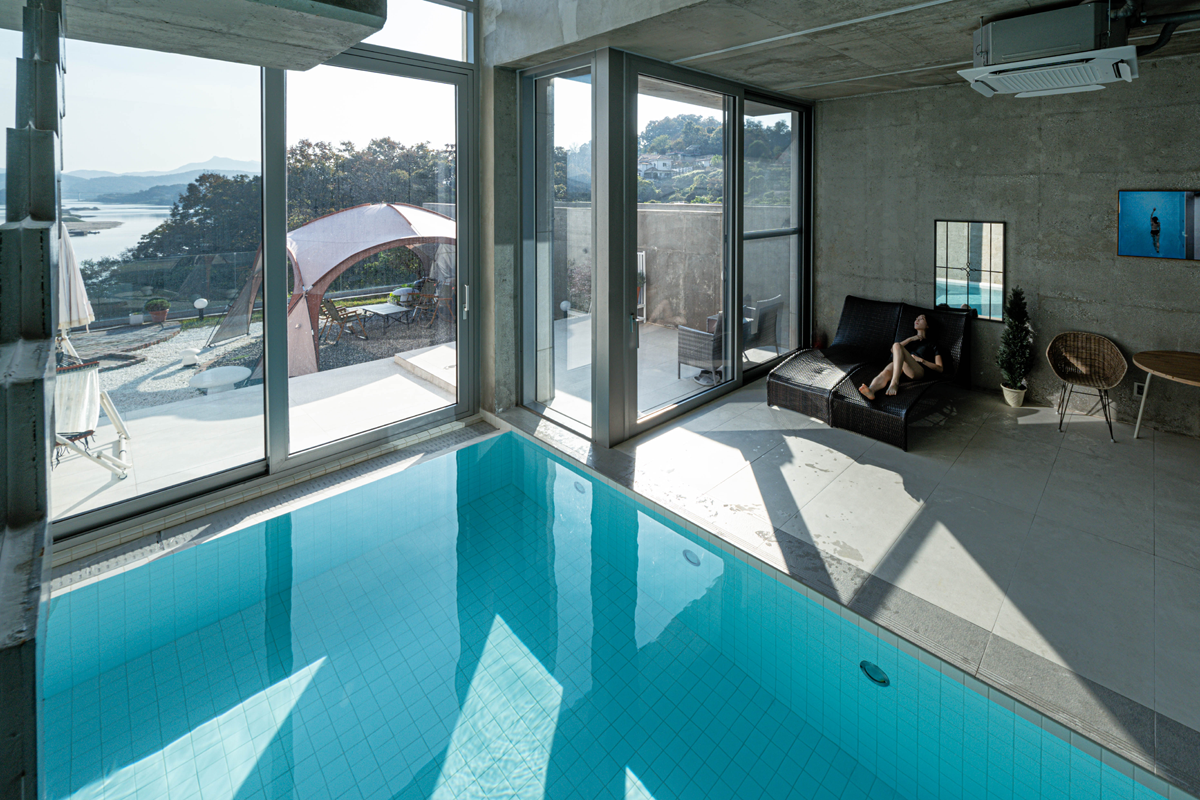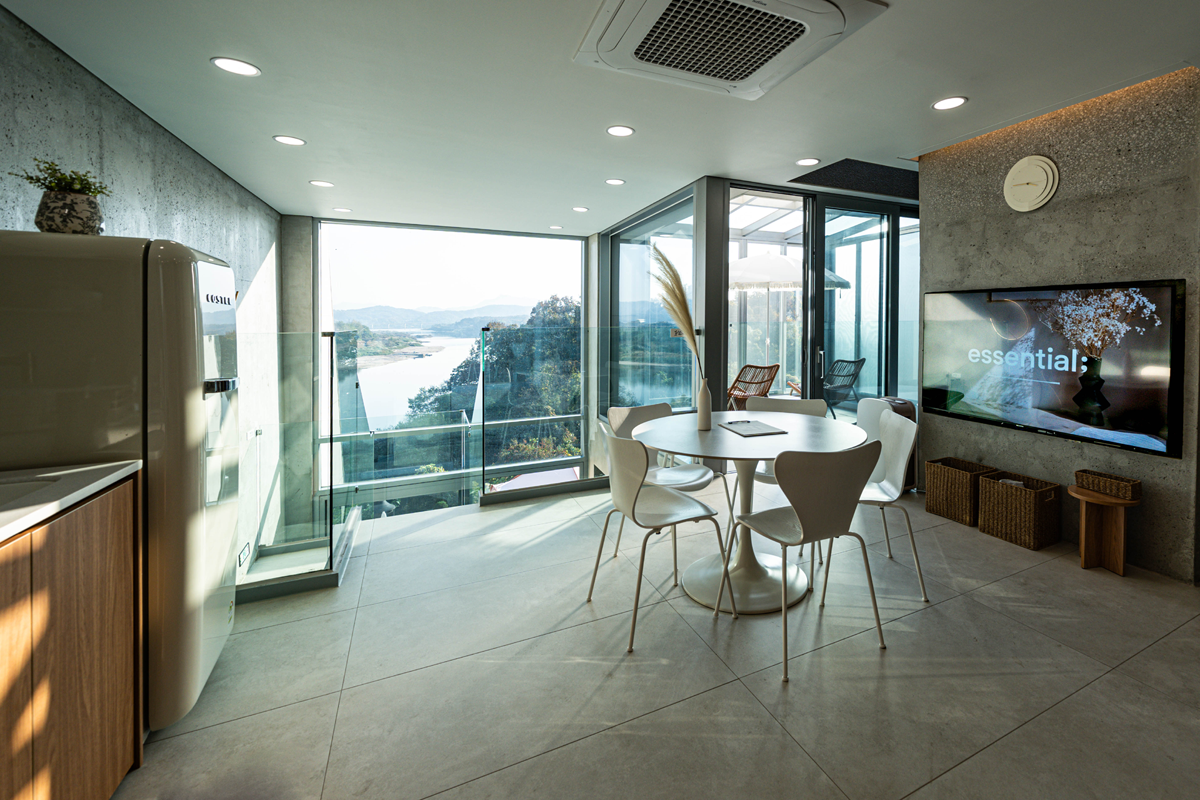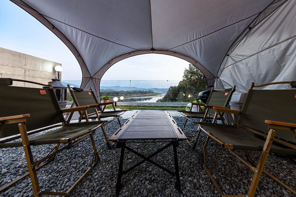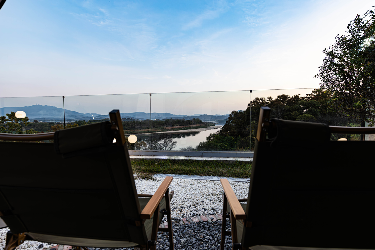 파노라마 임진강 뷰는 기본으로 대형 통창 커튼월바로 보여지는 경치는 서울근교 특히 파주 연천 지역에서는 찾아보기 힘든 멋진 리버뷰 경관이며 사계절 이용이 가능한 실내 대형 온수풀은 방문객들에게 많은 인기를 얻고 있습니다. 1층 수영장과 연결된 야외정원에서 캠핑장 분위기의 개별 바비큐와 데크위 감성벤치에서 강멍과 별멍도 즐기고 이른 아침 감악산 해돋이도 감상할 수 있는 곳입니다.