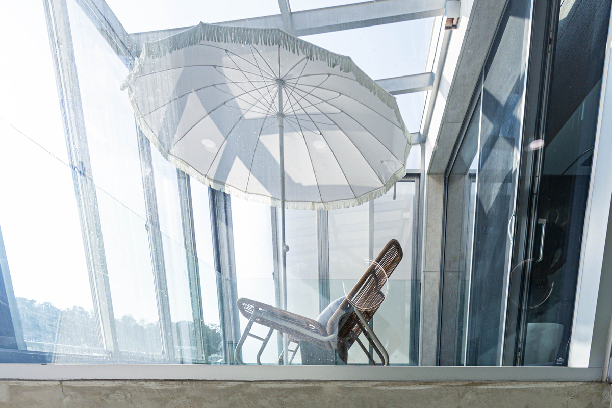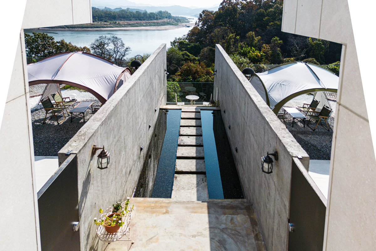 야외정원은 노출 콘크리트 옹벽이 설치되어 있어 프라이빗 하면서 임진강 방향 정면은 투명 강화유리 난간이 설치되어 있어 개방감있게 임진강 뷰를 더 가까이 감상할 수 있습니다.