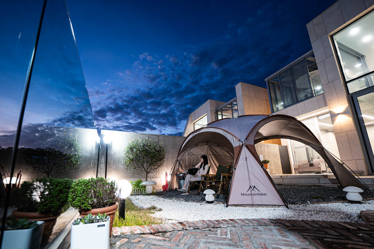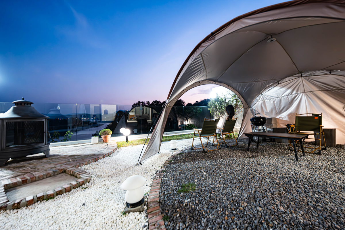 야외 정원에 새로 리뉴얼 된 그늘막 돔 셀터입니다. 캠핑 분위기에서 바비큐도 즐길 수 있습니다