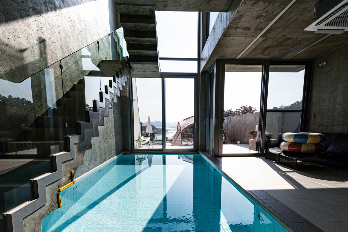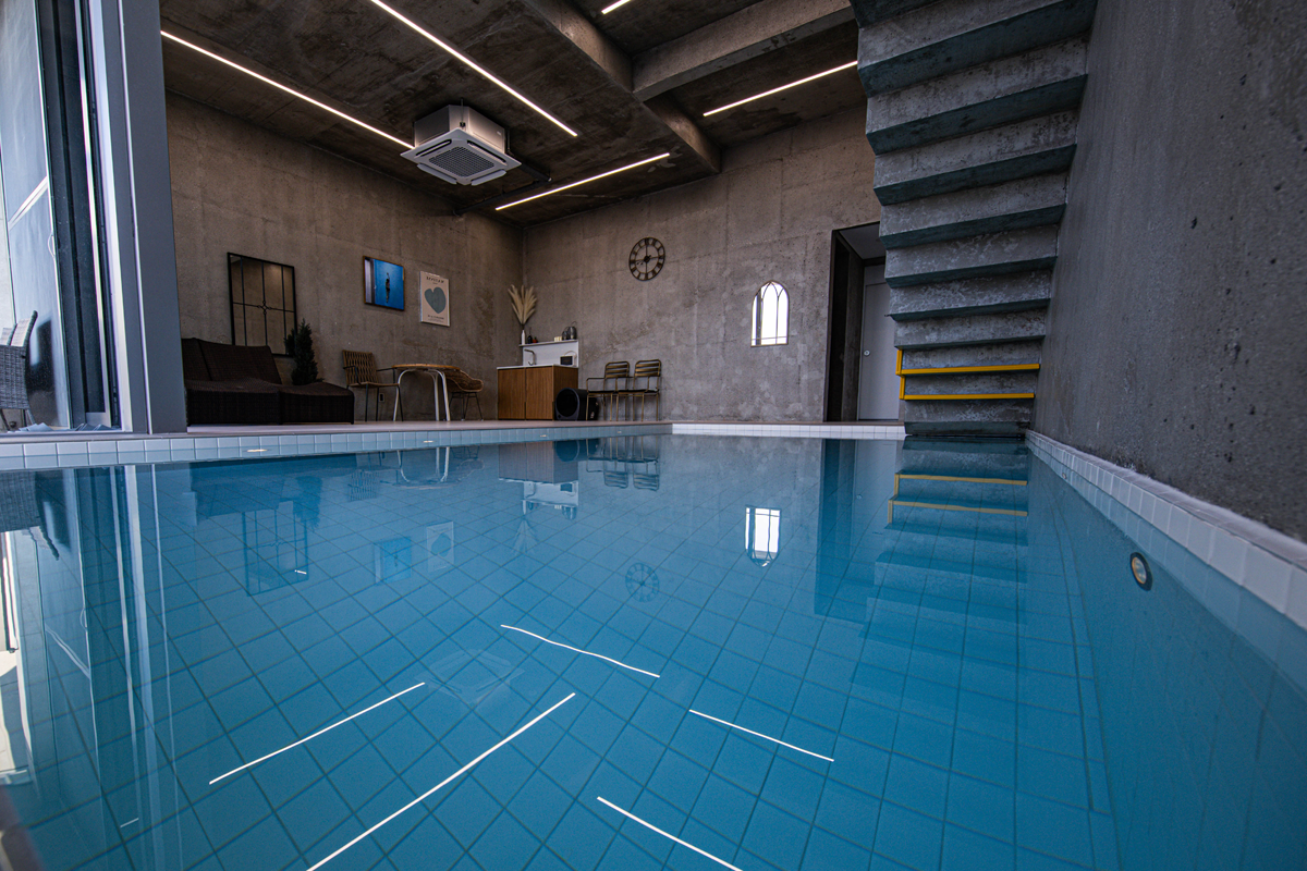 벨37 풀빌라는 홀과 수영장에 칸막이 벽이 없는 오픈형 수영장입니다. 대부분 실내에 수영장이 있는곳은 습기때문에 칸막이 벽을 설치하기도하는데 수영장은 목욕탕이 아니잖아요? 벨37 풀빌라는 오픈형 실내수영장이지만 제습설비가 잘 되어 있어 쾌적한 실내 환경을 유지시켜 주기 때문에 방문객들의 반응이 좋은 곳입니다.