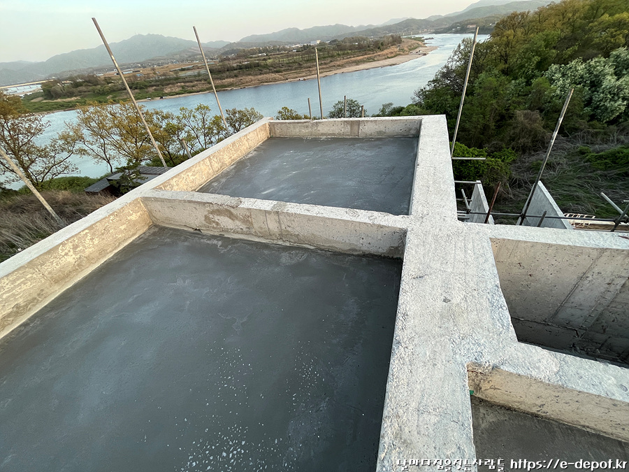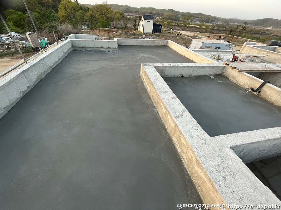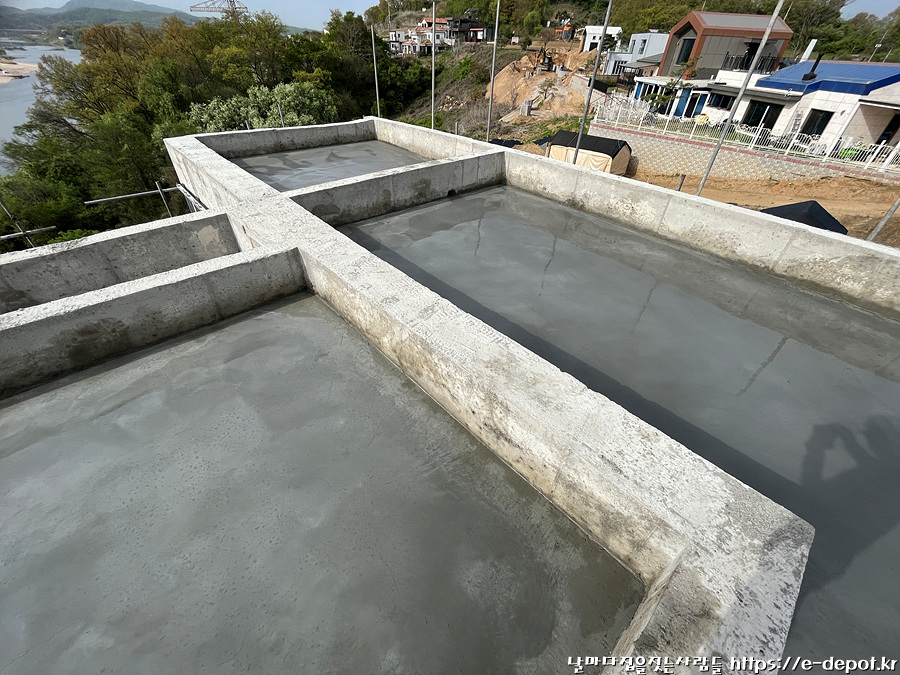 지붕층 누름콘크리트 타설시 제일 중요한 것은 빗물이 고이지 않도록 물구배를 정확히 맞춰줘야 합니다.