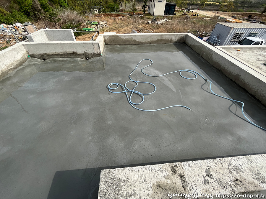 지붕 코너 보강 방수 후 누름콘크리트 타설을 하고 그 위에 노출우레탄 방수로 마감할 예정입니다.