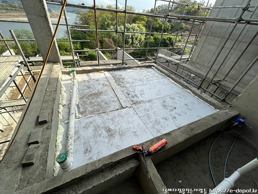 전망 좋은 2층 테라스 바닥의 누름콘크리트 타설 전 단열재 보강 사진입니다.