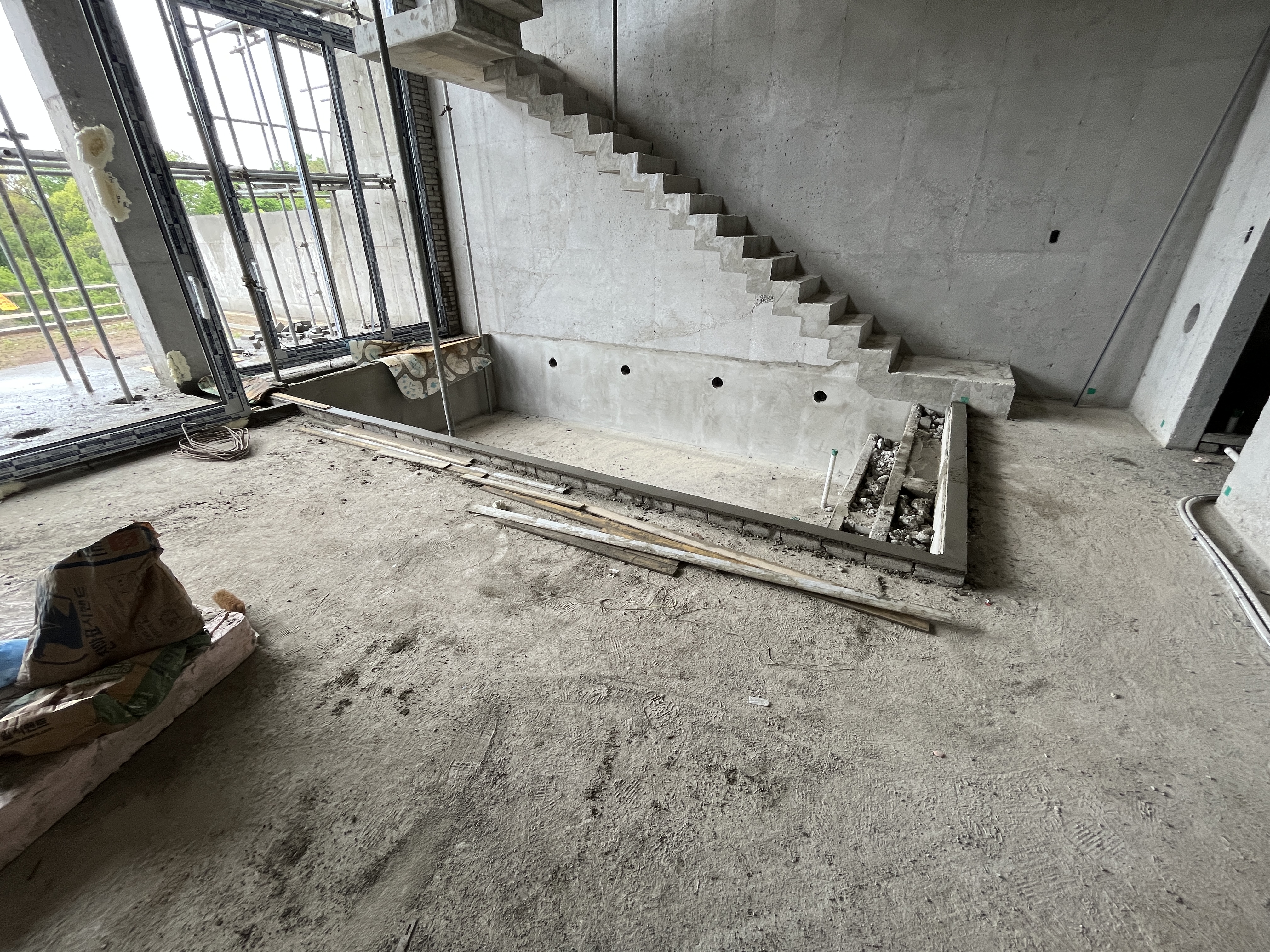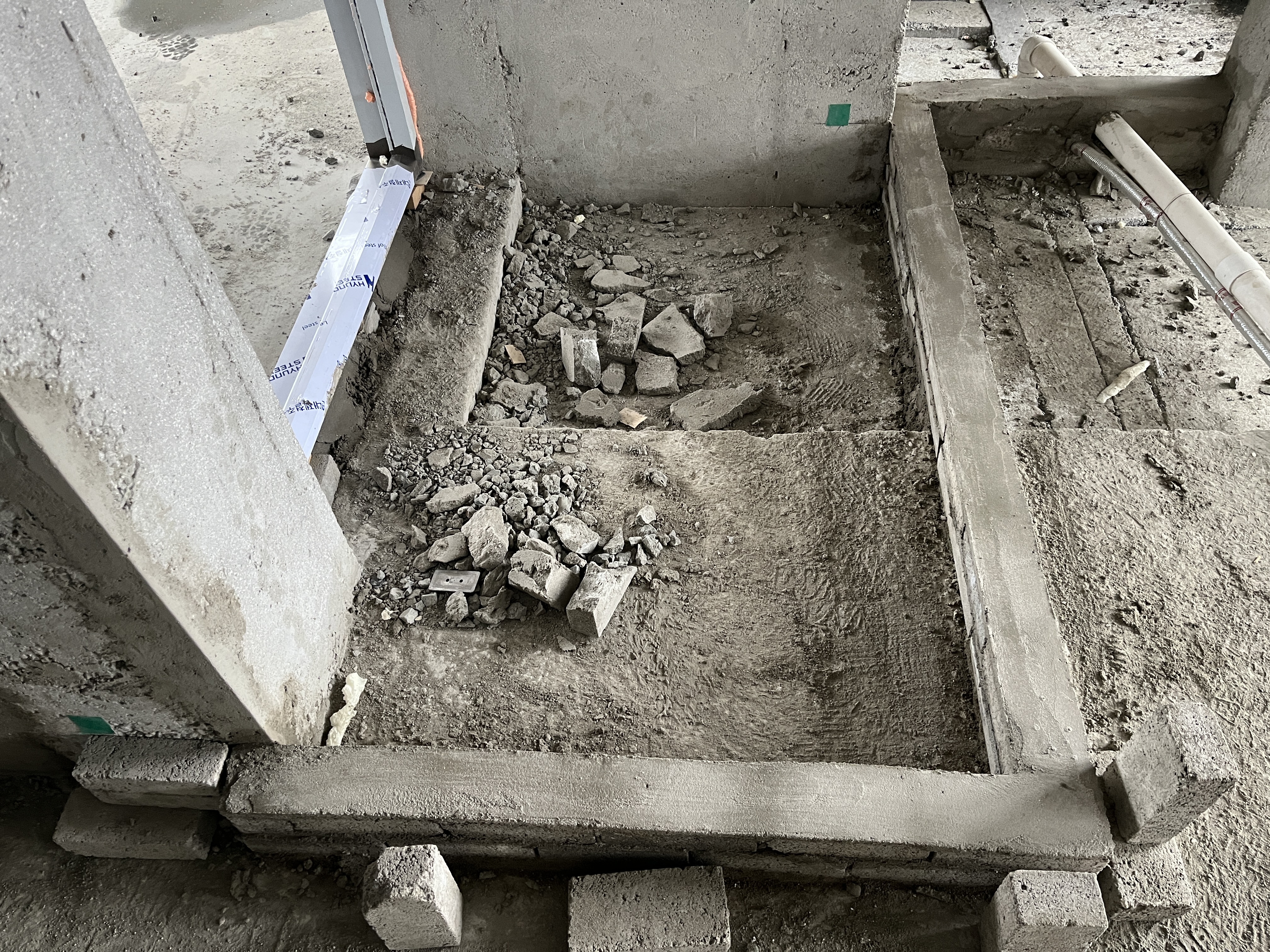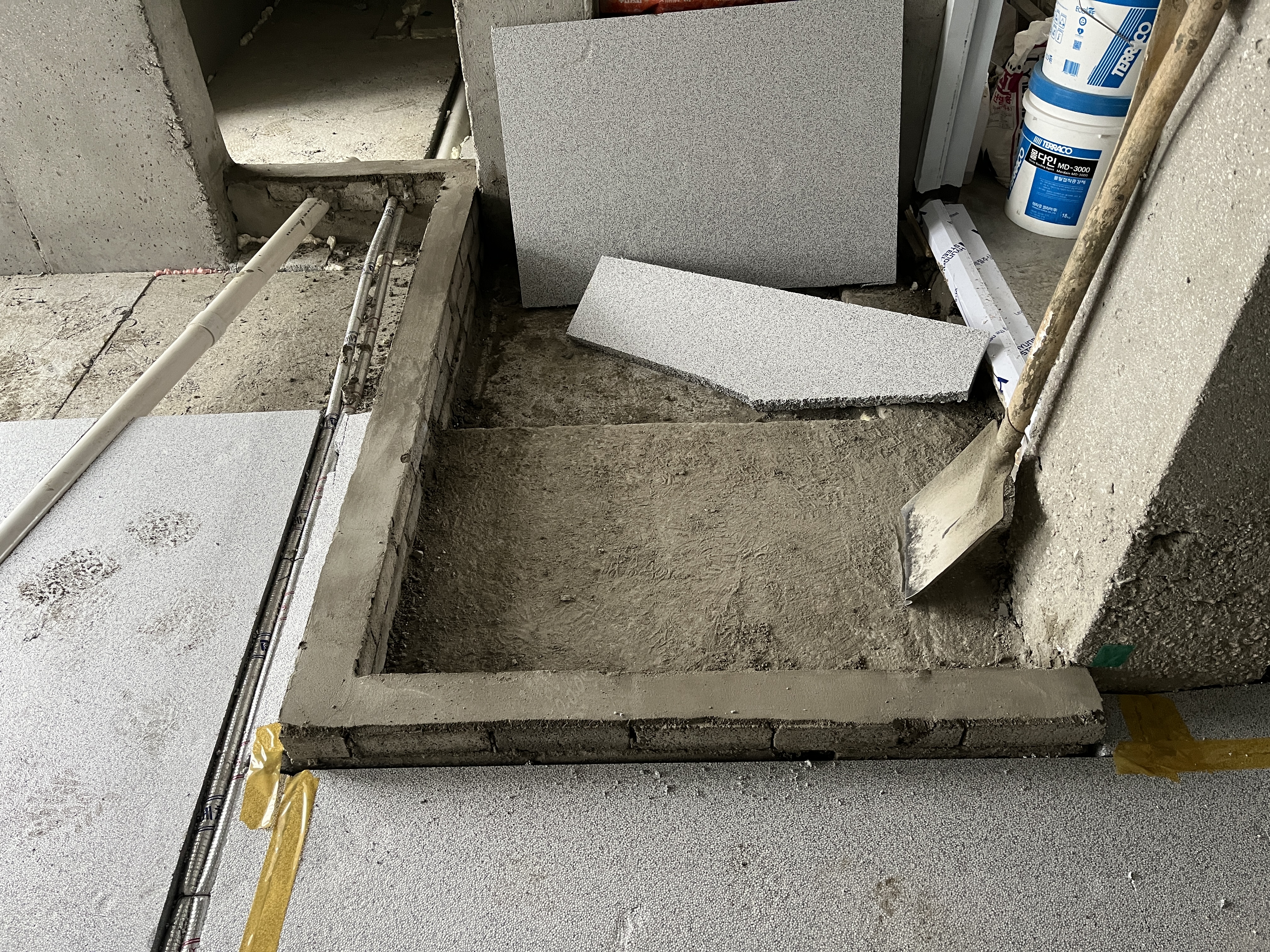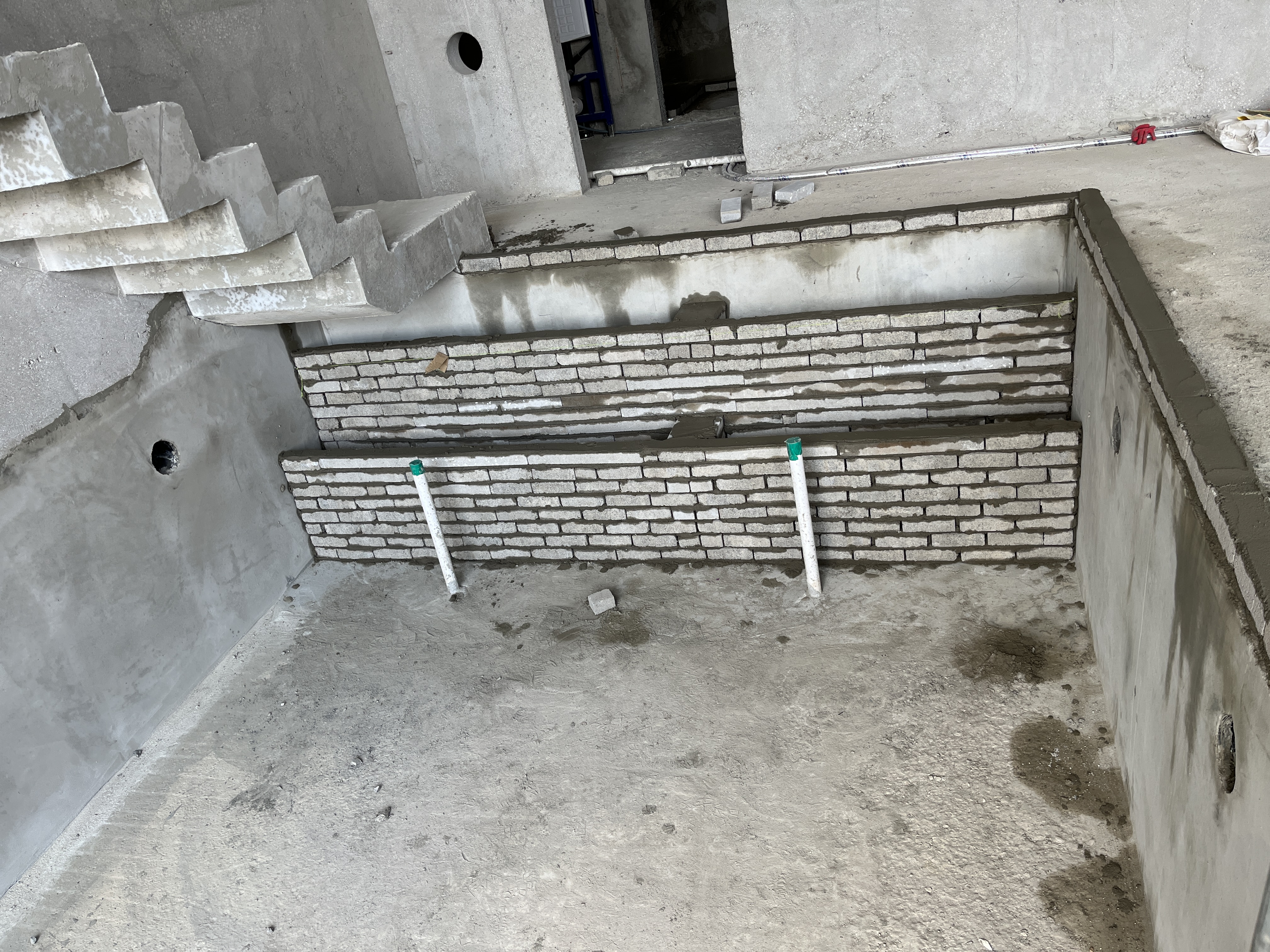 1층 수영장 홀에 단열기포타설을 위해 시멘트벽돌로 수영장과 홀사이 턱을 쌓은 사진입니다.