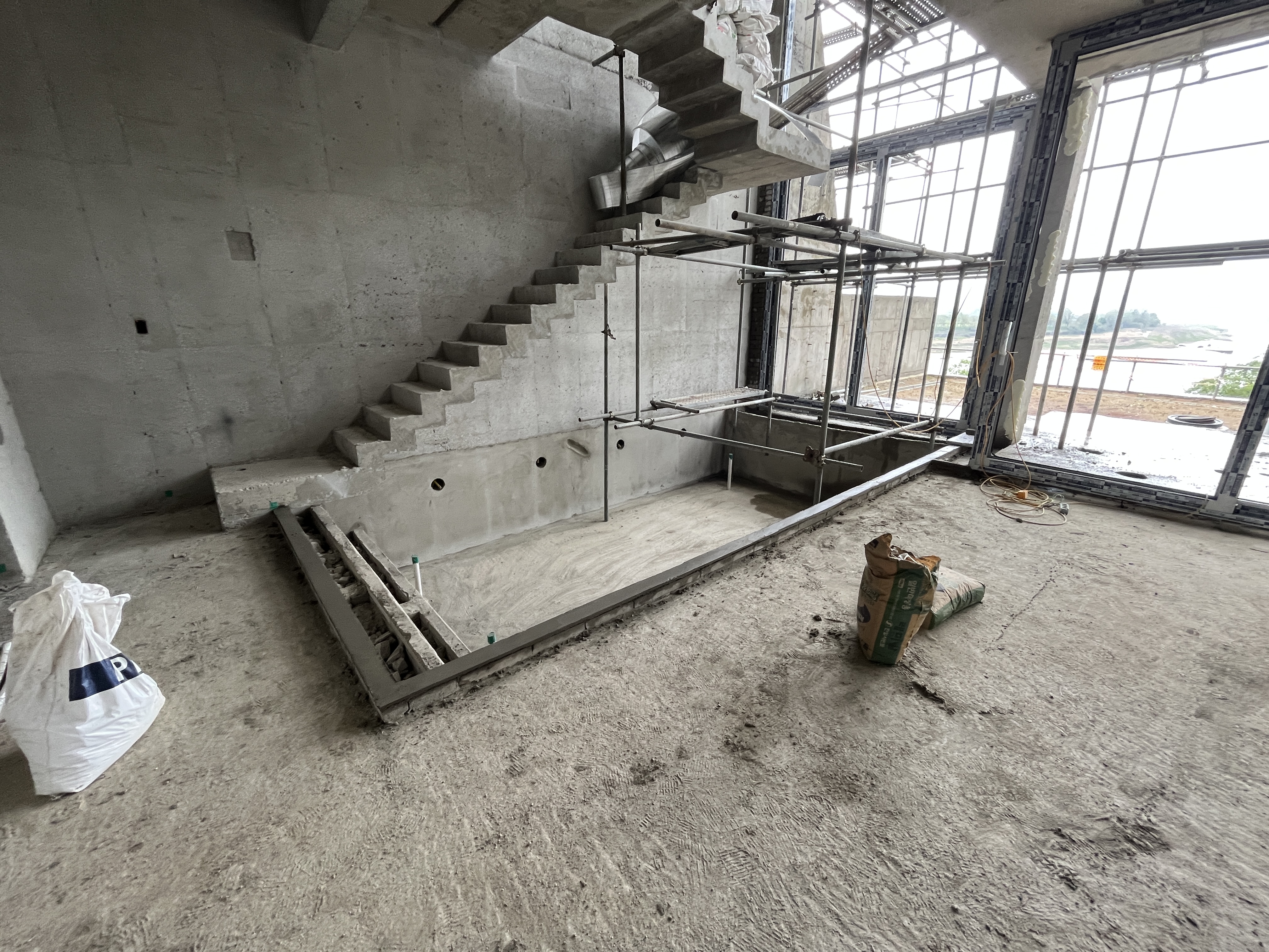 1층 수영장 홀에 단열기포타설을 위해 시멘트벽돌로 수영장과 홀사이 턱을 쌓은 사진입니다.