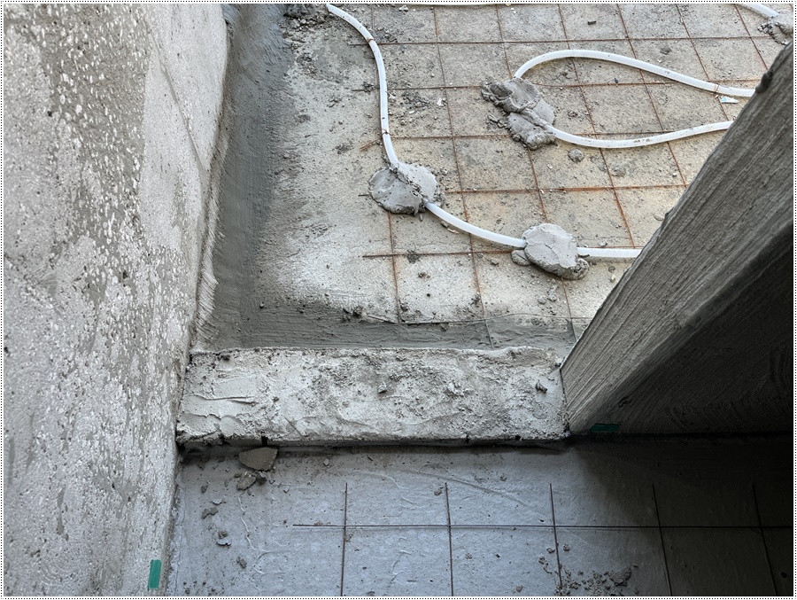 바닥 몰탈 타설 후 포세린 타일 마감을 한 침실과 홀