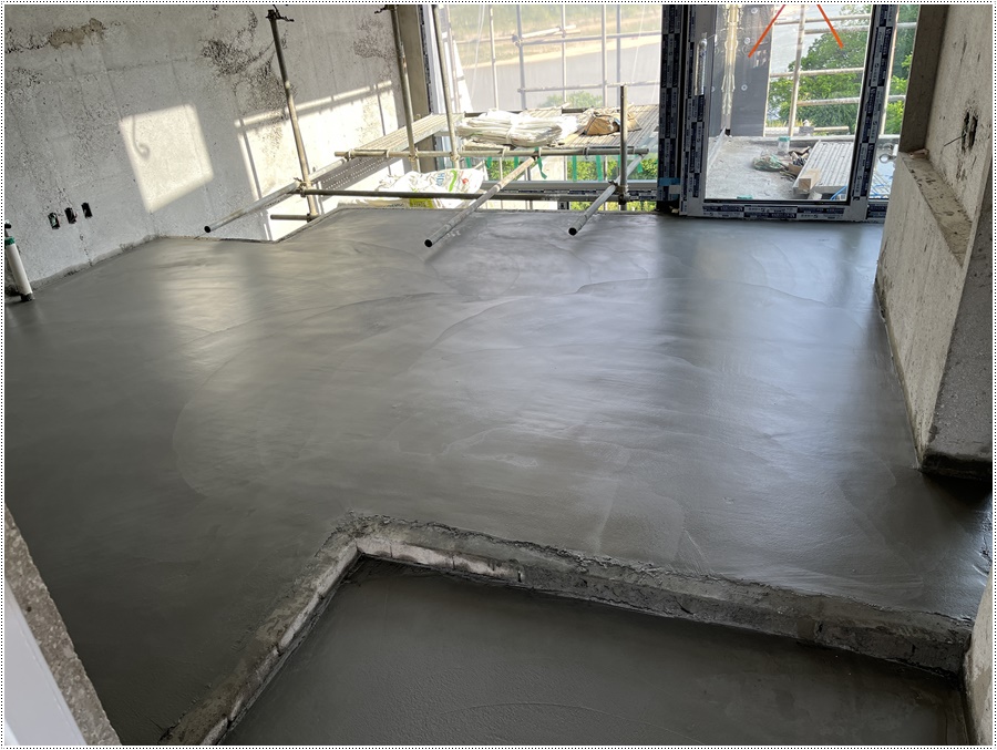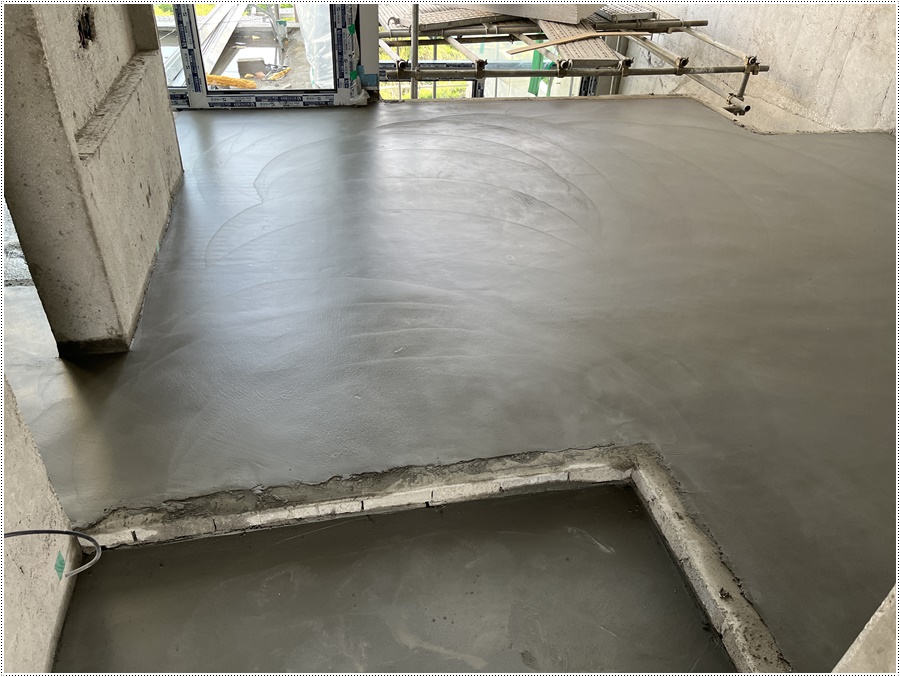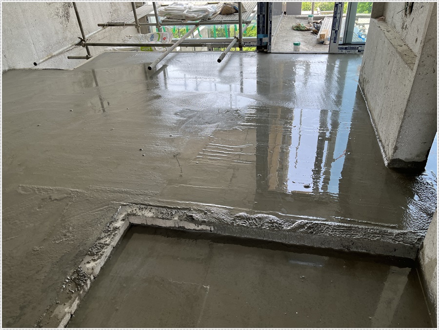 물이 어느정도 빠지면 몆차례 쇠흙손 면고르기 작업을 하면 바닥몰탈작업은 마무리 됩니다.