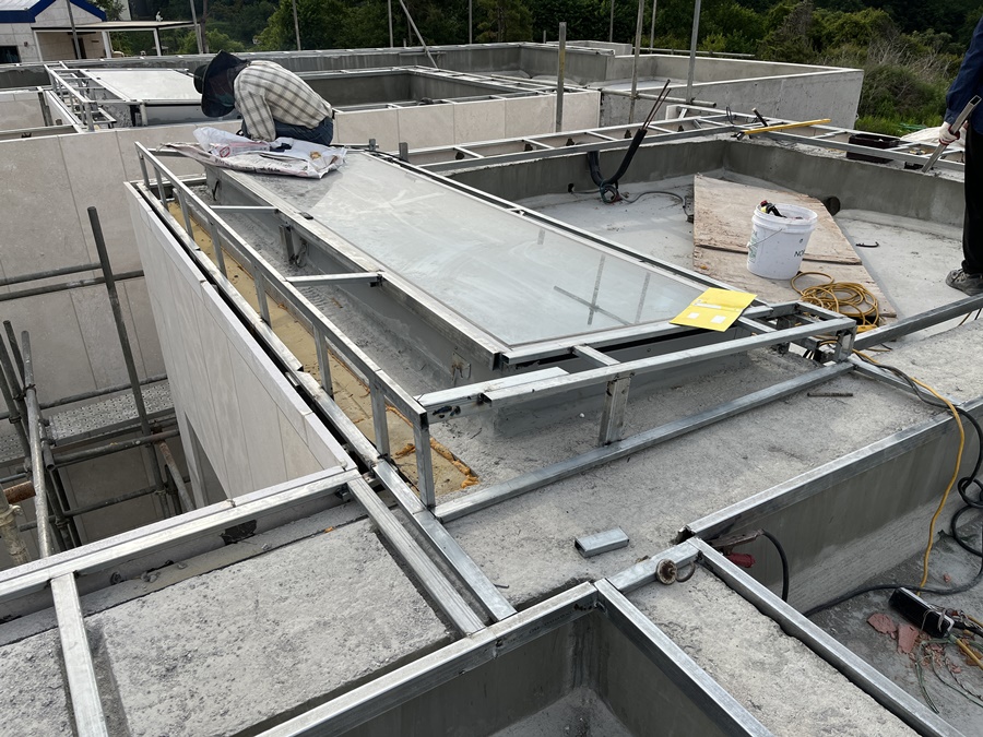 두겁을 시공 후 외부에서 보았을때 슬립하게 마감하기위해 각파이프 하지를 돌마감선에 맞추어 시공하였고 그 위에 12mm합판을 붙인 후 징크 마감 후 외부 라임스톤에 물이 타지 않도록 외부면으로 물끊김을 주어 최소 30mm 정도만 두겁 테두리가 외부에 노출되도록 합니다. 외부에 보이는 면이 넓어질수록 모던한 컨셉에 어긋나는것도 있지만 백색 징크에 빗물 등 외기에 노출된만큼 오염되는것이 유관으로 보여지기 때문에 미관상 좋지 않습니다. 두겁 윗 부분은 외부에서 보여지는 부분이 아니기때문에 방수 기능만 충실하면 되겠지요...^^