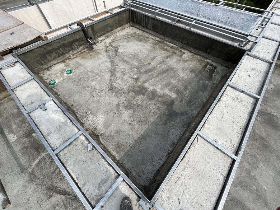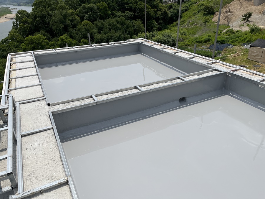 2단계 : 중도작업 -> 하도작업 후 1일 이후 도포합니다. 중도약품이 방수층을 형성하는 작업으로 최소 3mm 이상 균일하게 도포해 주도록 합니다.