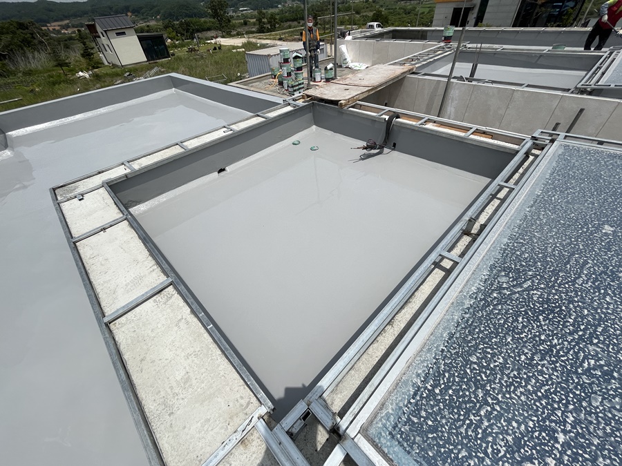 3단계 : 상도작업 -> 중도 작업 후 1일이 경과 된후 도포합니다. 중도층을 보호하는 역할을 하며 통상 2~3년에 한번씩 상도작업을 해주면 중도층이 보호되어 우레탄 방수층이 오래도록 지속됩니다. 기후 조건에 따라 주기적인 상도 도포 시기가 당려질 수도 있으니 방수층의 상황을 수시로 관찰하여 관리하는것이 좋습니다.