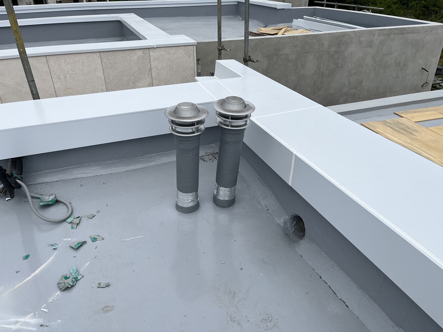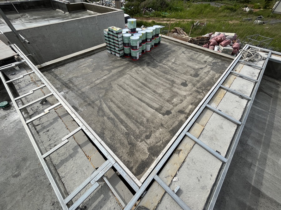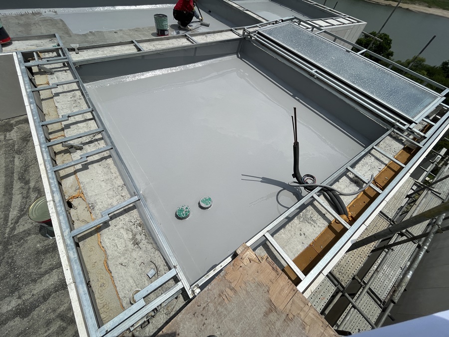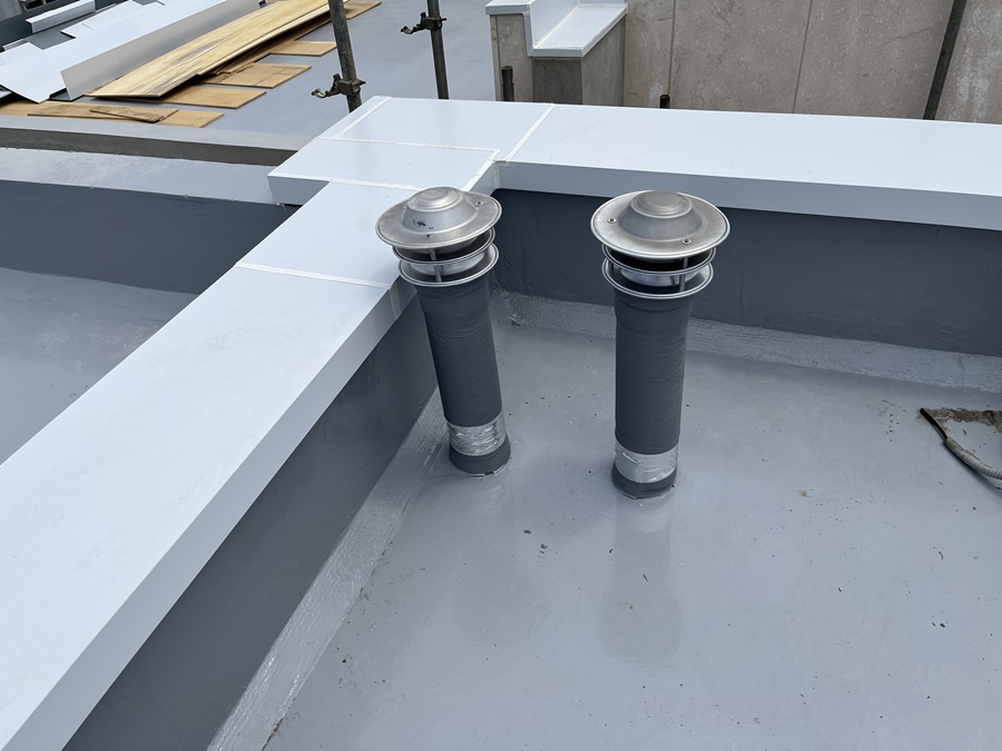 전체적으로 각파이프 하지 작업을 마친 후 징크 마감작업전에 노출 우레탄 방수 작업을 진행하였습니다. 징크작업을 먼저 마감하게 되면 우레탄 작업시 오염을 피할 수 가 없고 우레탄 작업이 번거로워서 각파이프 작업만 해놓고 우레탄 작업을 먼저 끝내는것이 좋습니다.
