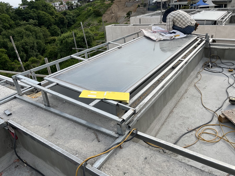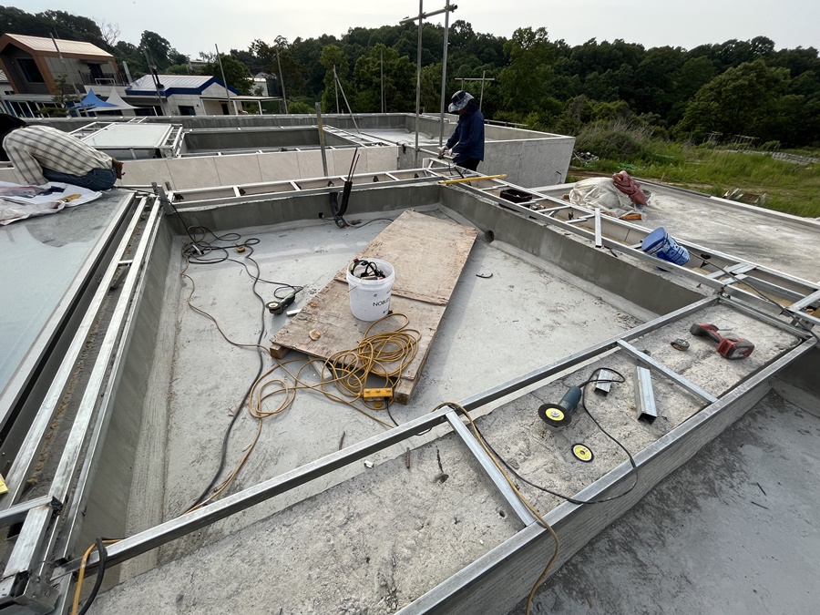 두겁을 시공 후 외부에서 보았을때 슬립하게 마감하기위해 각파이프 하지를 돌마감선에 맞추어 시공하였고 그 위에 12mm합판을 붙인 후 징크 마감 후 외부 라임스톤에 물이 타지 않도록 외부면으로 물끊김을 주어 최소 30mm 정도만 두겁 테두리가 외부에 노출되도록 합니다. 외부에 보이는 면이 넓어질수록 모던한 컨셉에 어긋나는것도 있지만 백색 징크에 빗물 등 외기에 노출된만큼 오염되는것이 유관으로 보여지기 때문에 미관상 좋지 않습니다. 두겁 윗 부분은 외부에서 보여지는 부분이 아니기때문에 방수 기능만 충실하면 되겠지요...^^