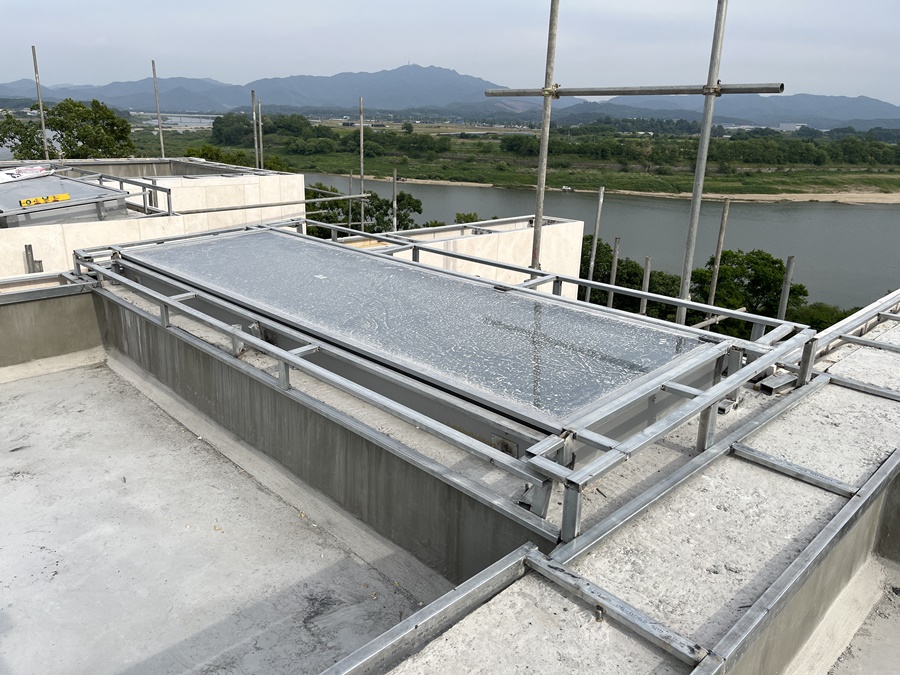 하지작업에 사용하는 각파이프는 아연각관을 사용하였고 두겁에 빗물이 떨어질때 외부 라임스톤으로 물이 타지 않도록 하지작업시 물매를 지붕 안쪽으로 유도하여 시공합니다.