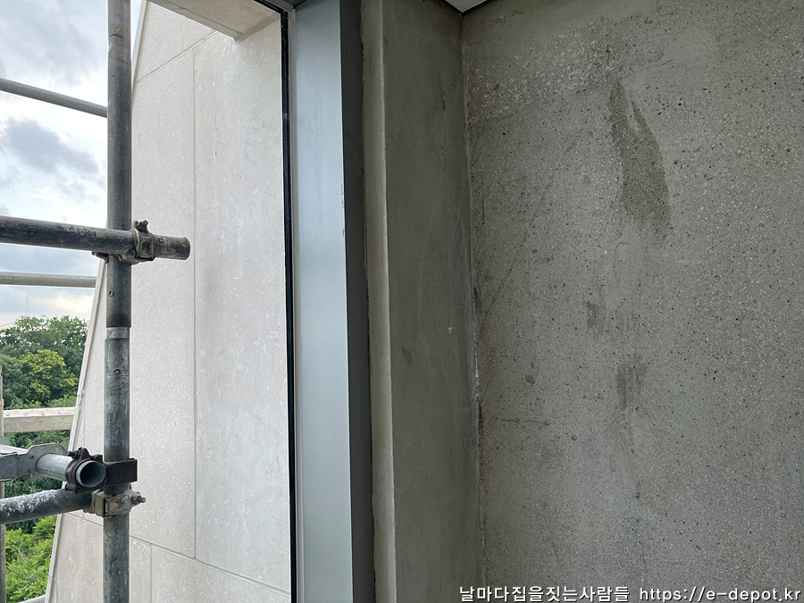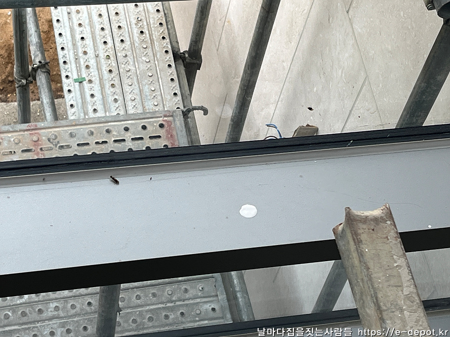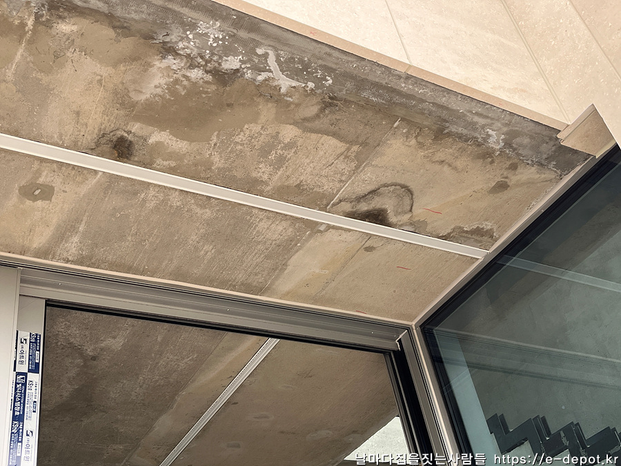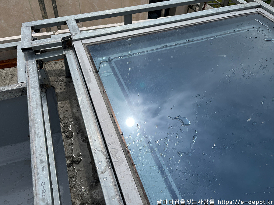 시공전부터 누누이 얘기하고 지시했던 부분인데 유리시공자가 무시하고 설치하여 비가 올 때 물고임 현상이 발생하였습니다.