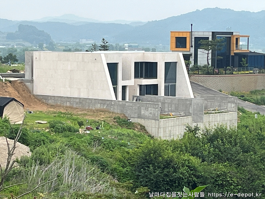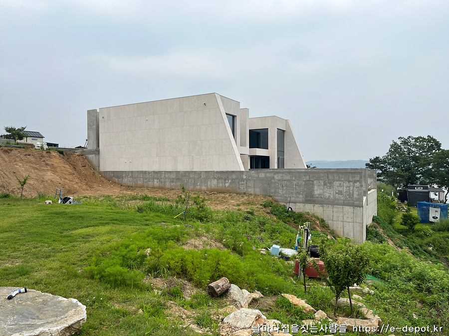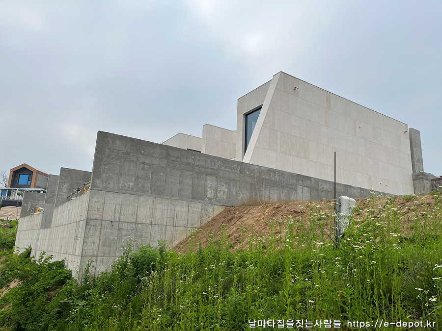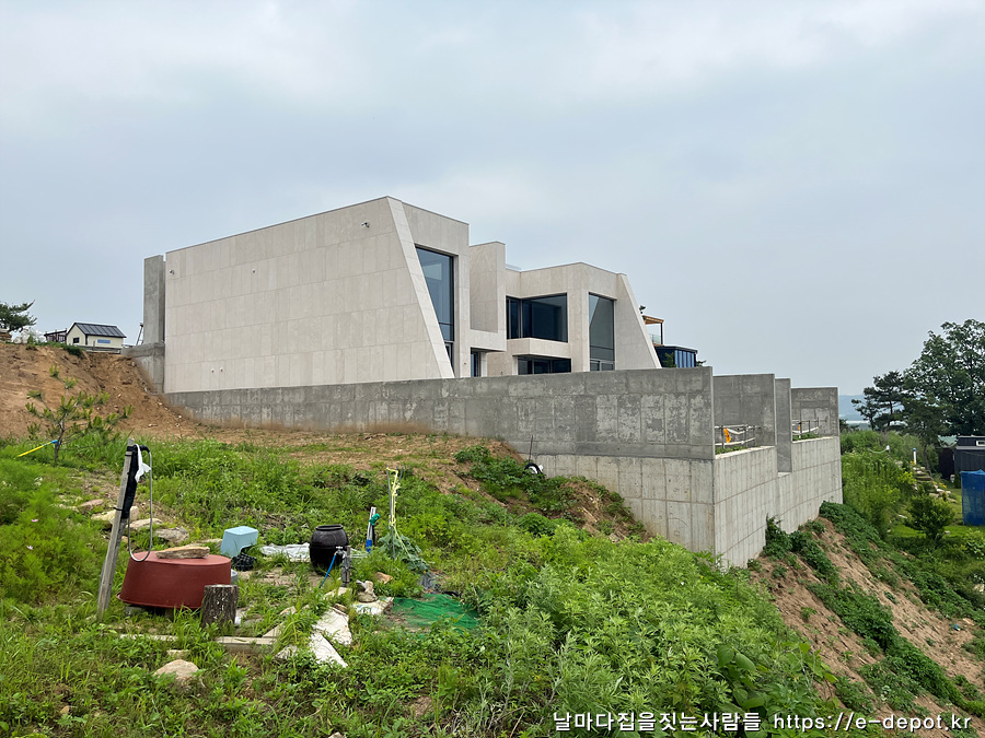 처음 스케치했던 모습과 지붕의 각도가 평행으로 바뀌어 아쉽긴 하지만 프라이빗한 공간을 확보하기 위한 임진강 방향 사선옹벽은 계획대로 잘 완성된것 같네요..^^