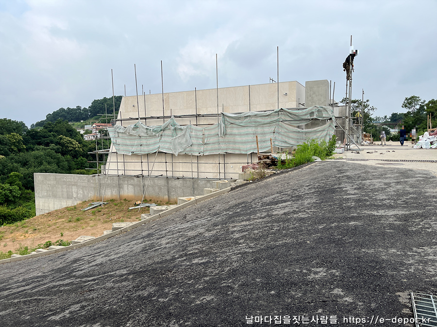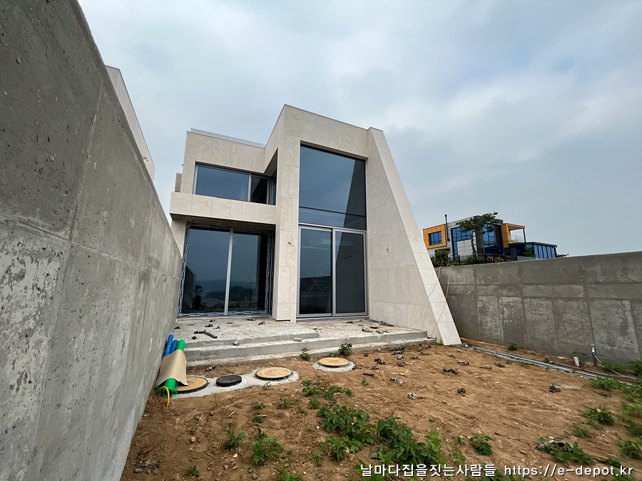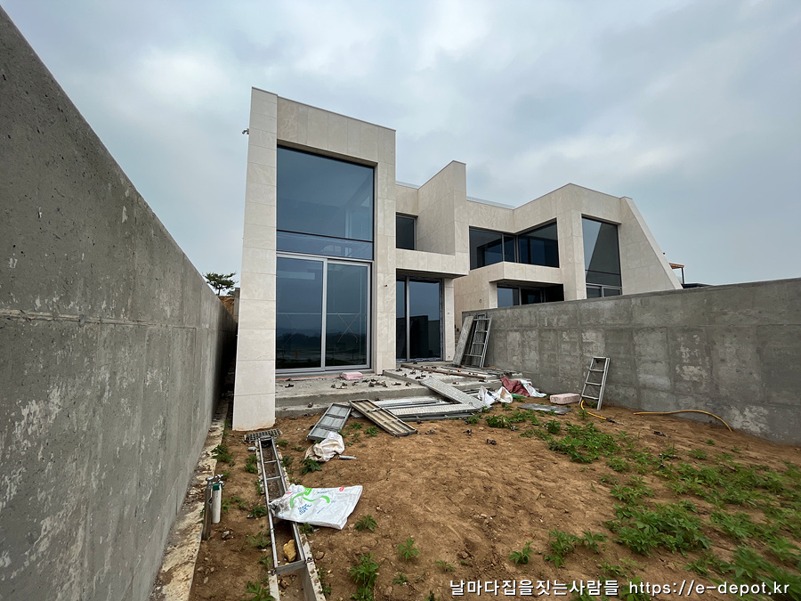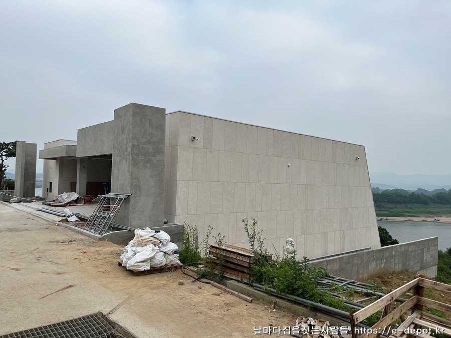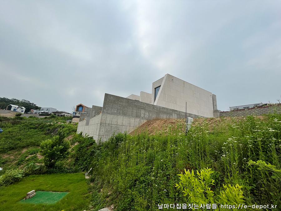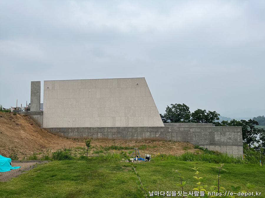 처음 스케치했던 모습과 지붕의 각도가 평행으로 바뀌어 아쉽긴 하지만 프라이빗한 공간을 확보하기 위한 임진강 방향 사선옹벽은 계획대로 잘 완성된것 같네요..^^