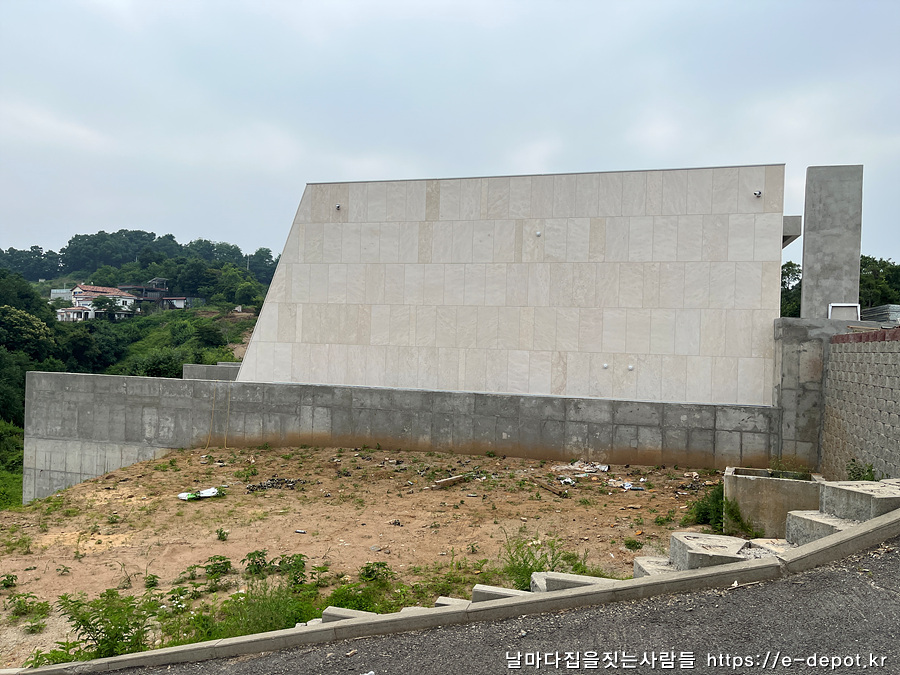 지대가 낮은 부분에 옹벽공사를 한 후 옹벽 상부에 담장을 연장하는식으로 공사를 마무리 하였습니다.