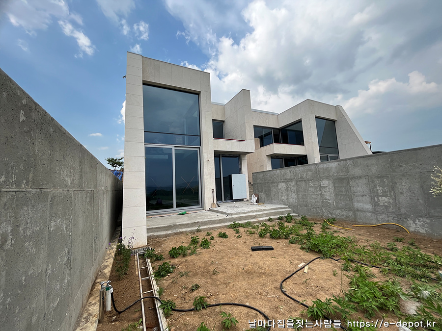 날마다 집을 짓는 사람들의 전망 좋은 풀빌라 펜션 유리 안전난간 설치 및 조경수 이식 과정이었습니다.