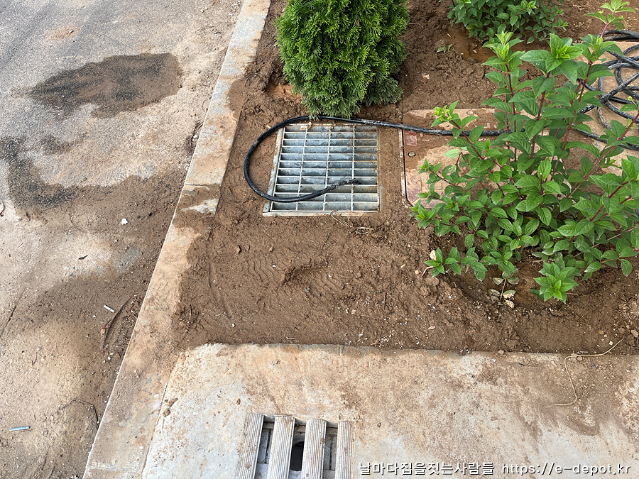 야외 정원의 물 빠짐을 원활히 하기 위한 수로관 배수설비 사진입니다.