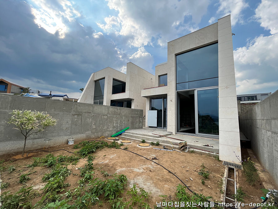 날마다 집을 짓는 사람들의 전망 좋은 풀빌라 펜션 유리 안전난간 설치 및 조경수 이식 과정이었습니다.