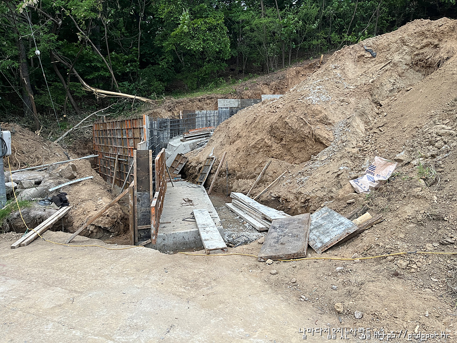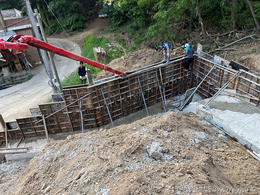 날마다 집을 짓는 사람들의 고양시 내유동 전원주택 신축사례. 옹벽 거푸집 조성 및 철근 배근 후 콘크리트타설과정이었습니다.