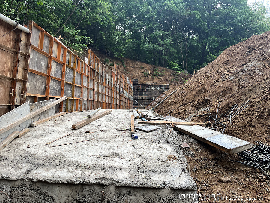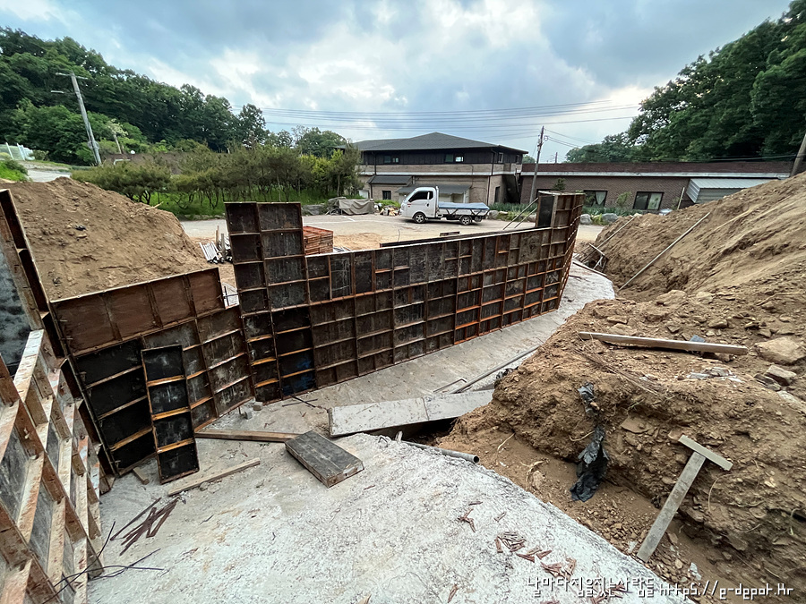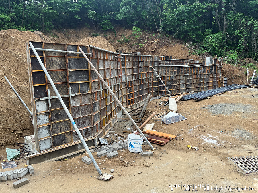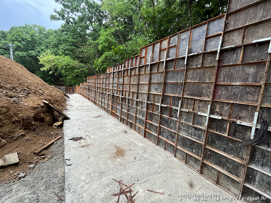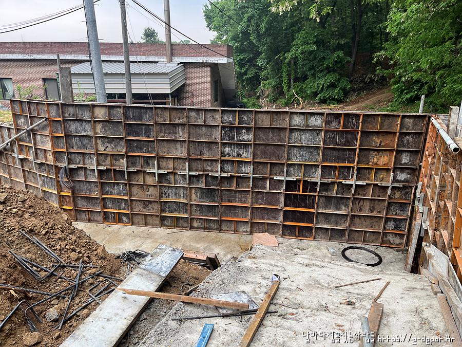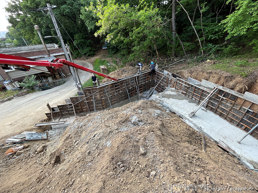 날마다 집을 짓는 사람들의 고양시 내유동 전원주택 신축사례. 옹벽 거푸집 조성 및 철근 배근 후 콘크리트타설과정이었습니다.