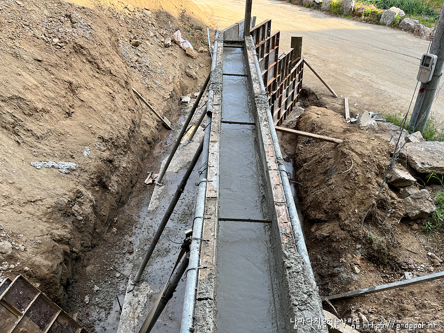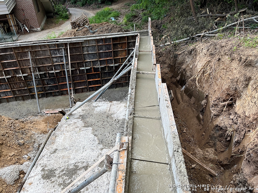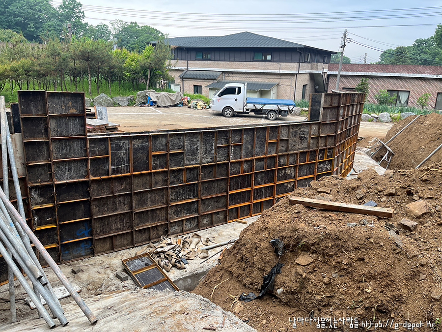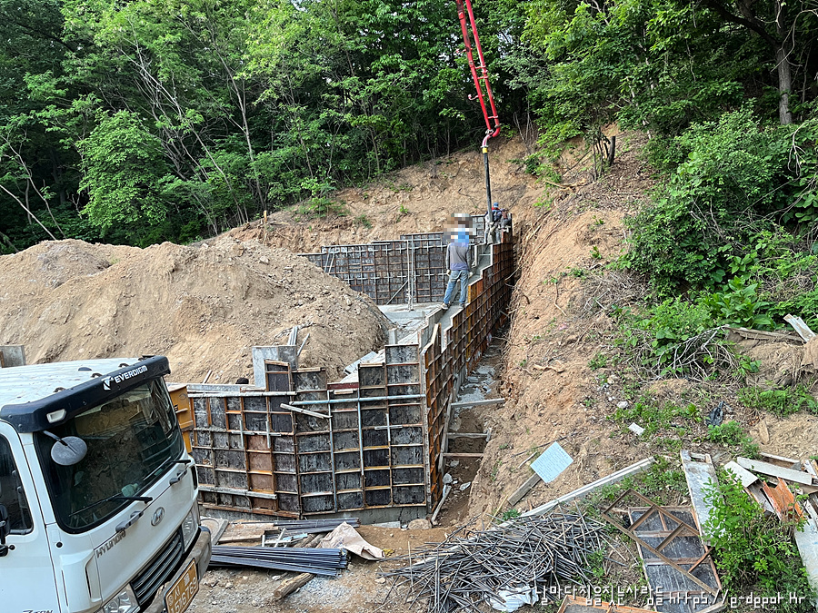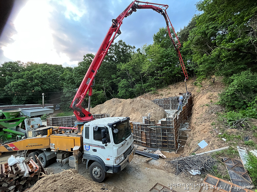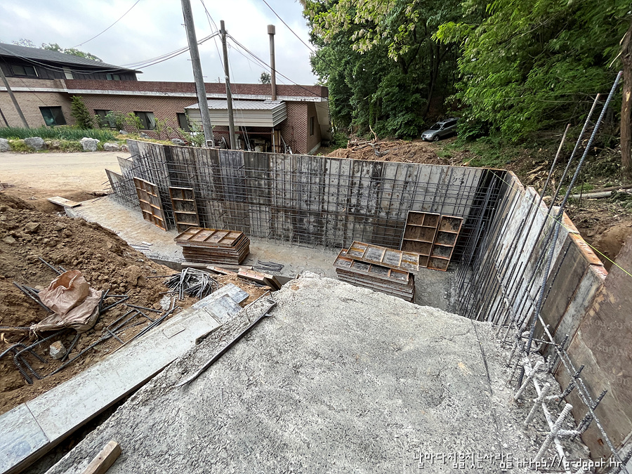 날마다 집을 짓는 사람들의 고양시 내유동 전원주택 신축사례. 옹벽 거푸집 조성 및 철근 배근 후 콘크리트타설과정이었습니다.