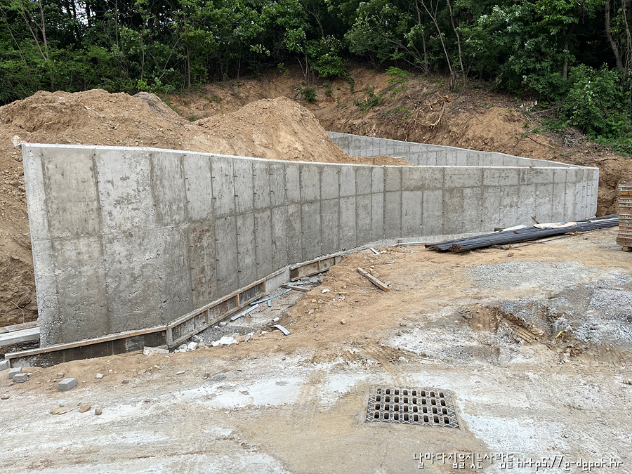 고양시 내유동 전원주택 철근콘크리트 L형 옹벽 거푸집 해체 후 모습을 드러냈습니다.