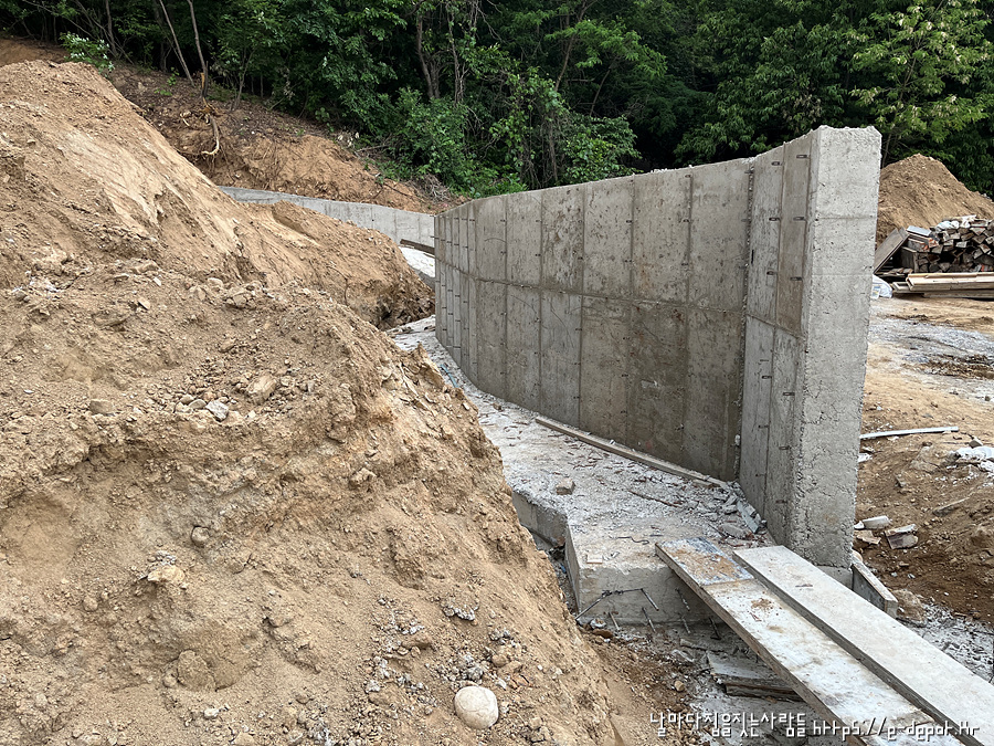 고양시 내유동 전원주택 철근콘크리트 L형 옹벽 거푸집 해체 후 모습을 드러냈습니다.