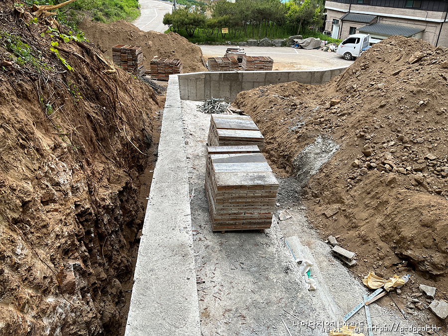 L형 옹벽 두께 300mm 높이는 3미터로 제한되어 대지 G.L 면에서 배면의 옹벽 최고 높이가 3미터를 초과하지 않도록 작업하였습니다.