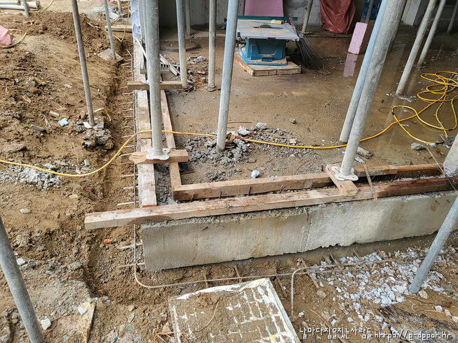 외부 치장벽돌 기초를 만들기 위한 거푸집 설치 사진입니다.
