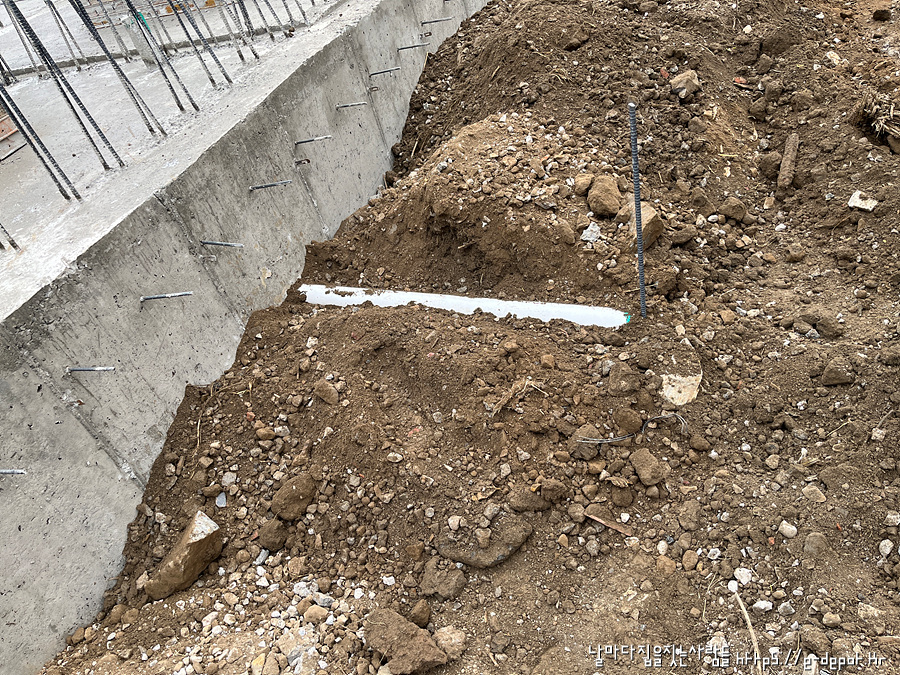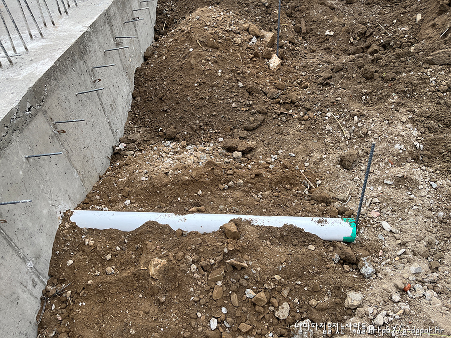 되메우기 작업 시 외부 하수관 배출 부위를 쇠말뚝을 박아 표시를 해두면 차후 성토 후 배수설비 작업시 파손을 방지하고 분기점 찾기가 쉽겠지요..^^