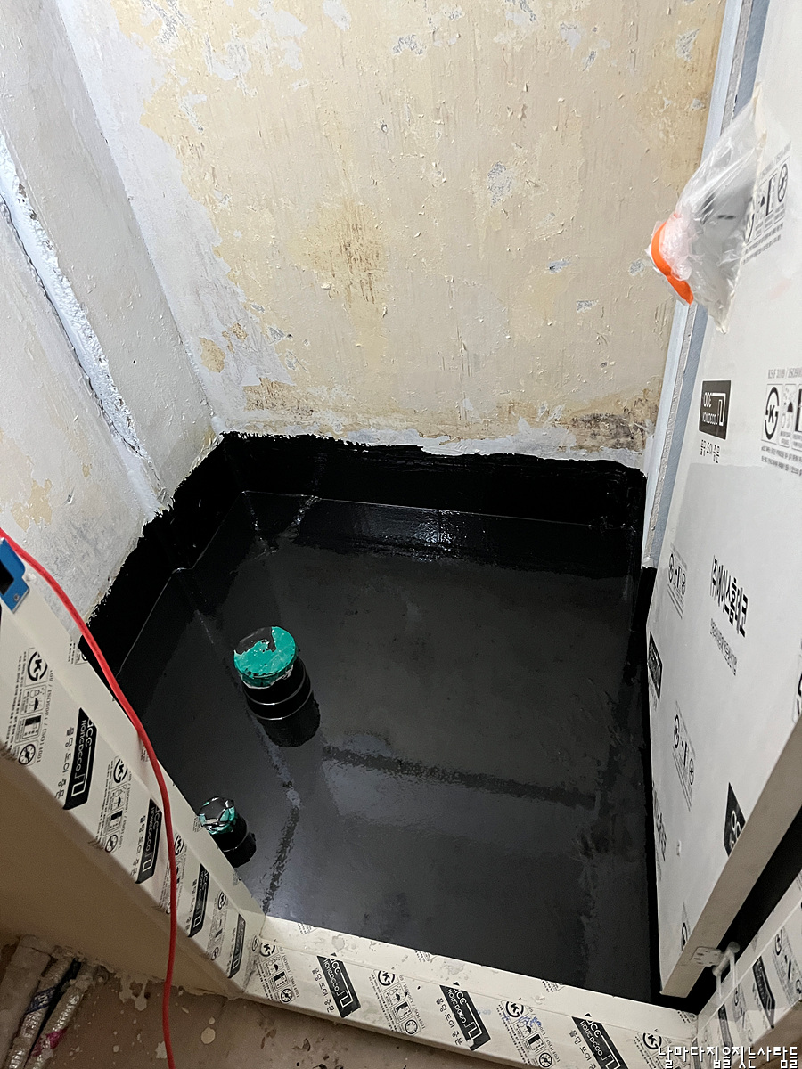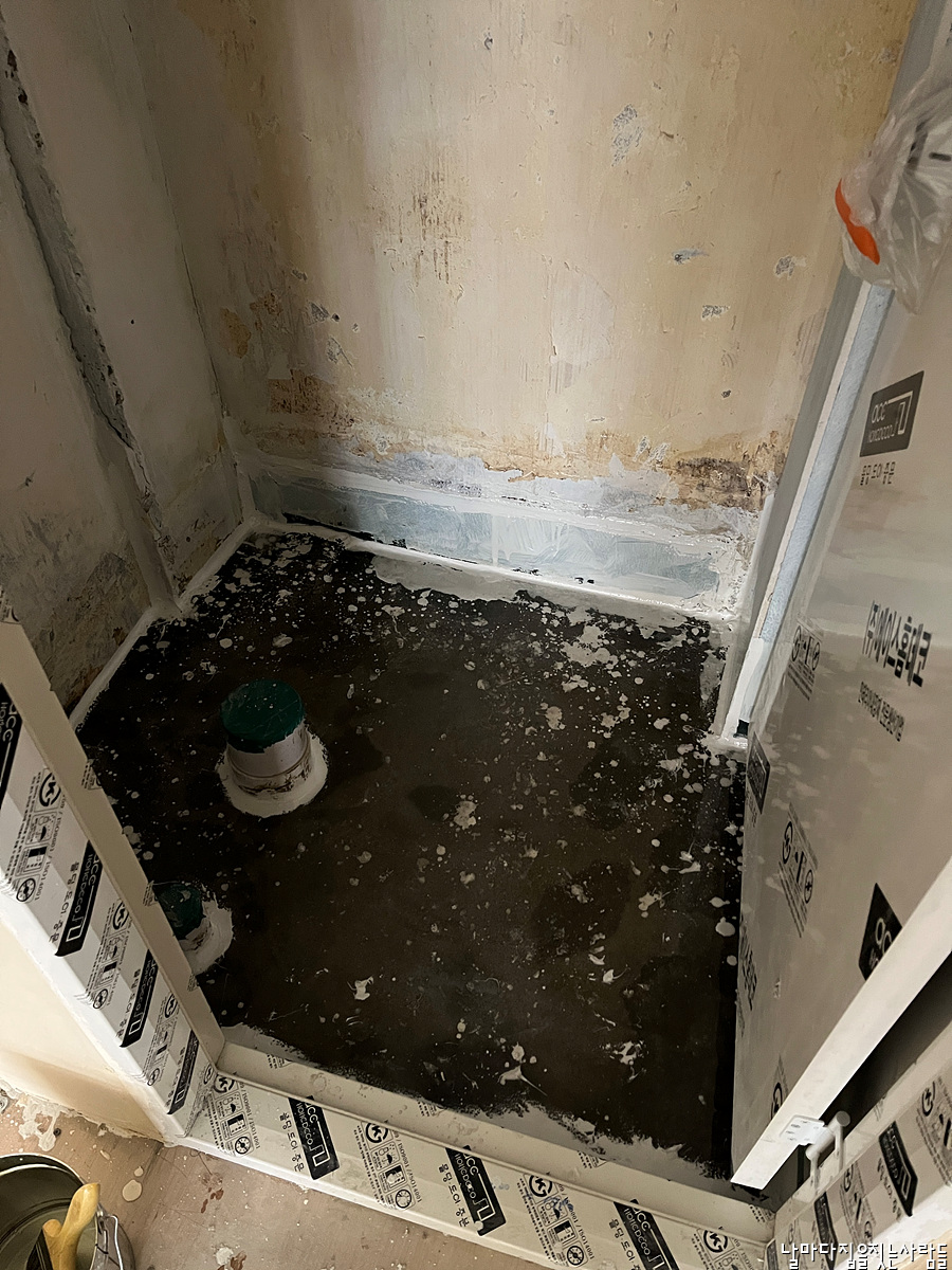 위생 배관을 마치고 몰탈타설 후 1차 시멘트 액체 방수를 하였습니다.