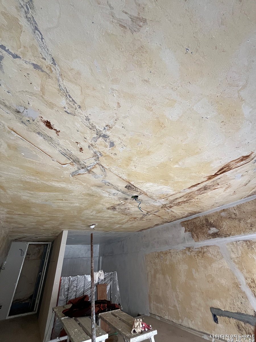 앗! 유럽미장 1차 마감 후 일부 천정에서 오염 발생... 오염 부위는 건조 후 2차 보강작업을 진행하도록 해야겠네요..