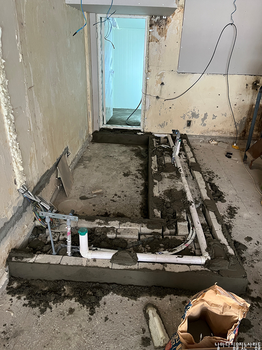 주방 배관후 보호턱 시공 사진입니다. 주방 겸 카운터로 사용할 계획입니다.