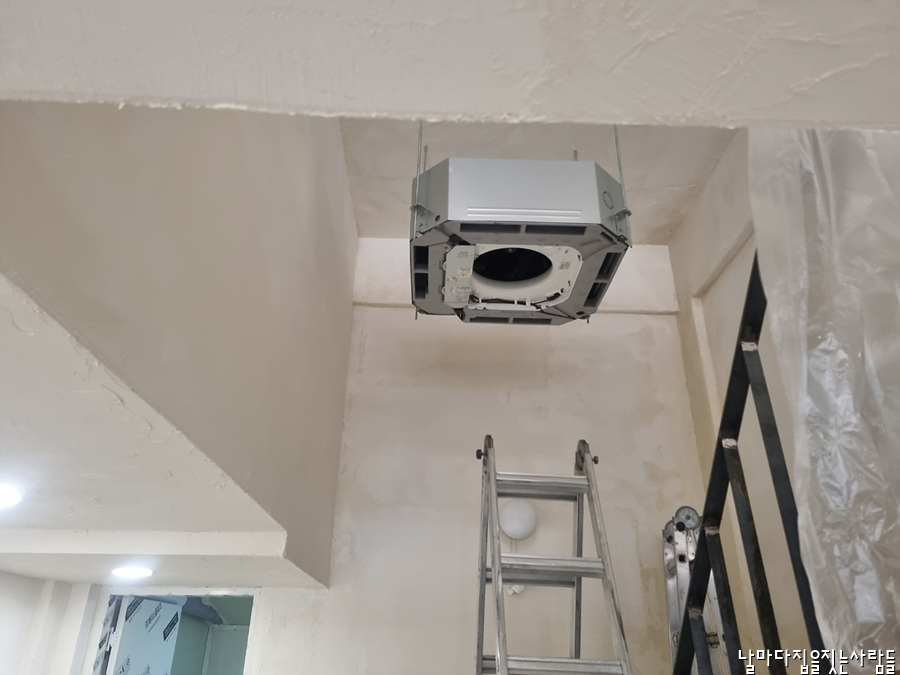 유럽미장 마감 후 계단실 천정에 4 way 시스템 냉난방기 설치
