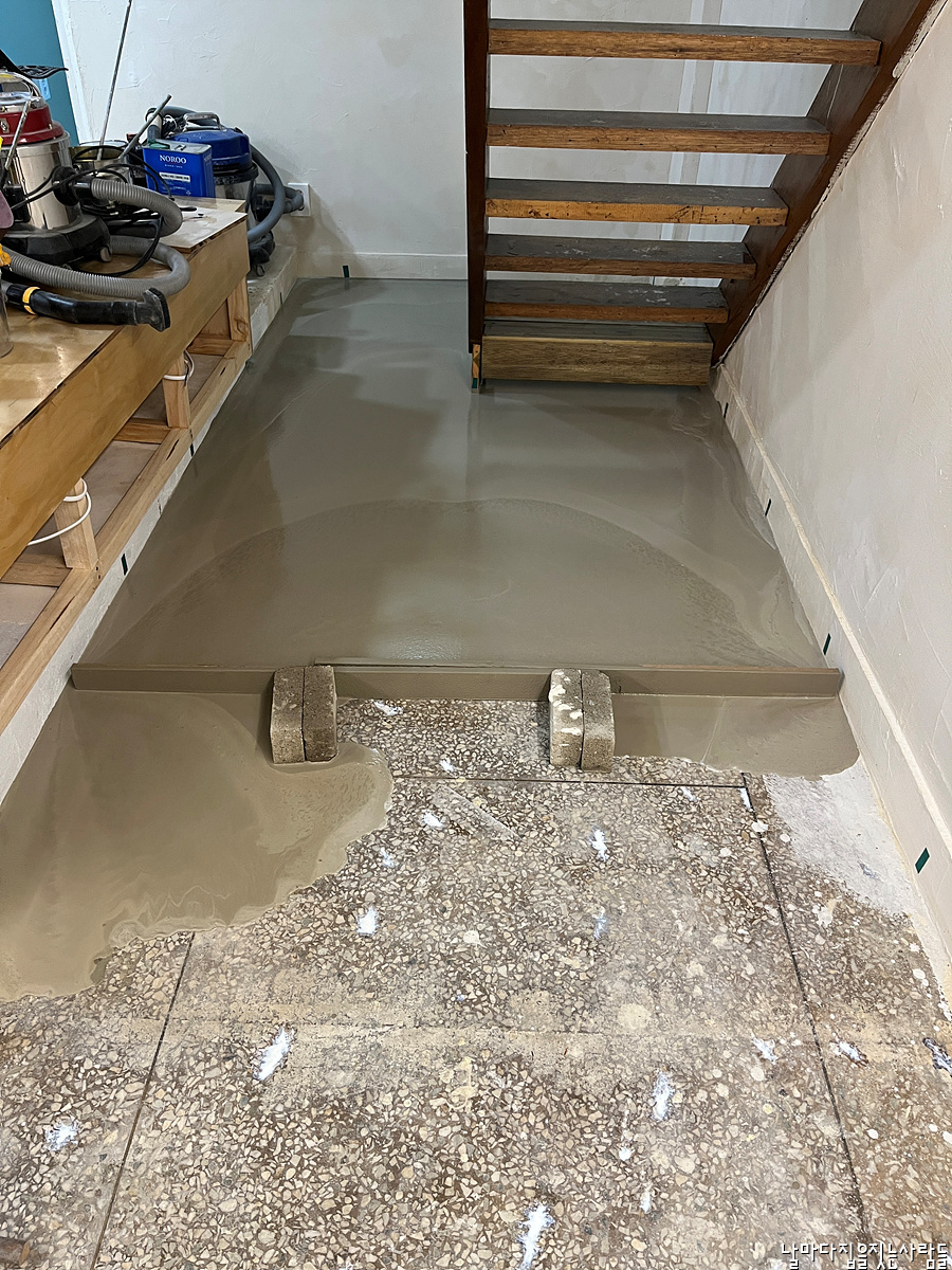 1. 수평몰탈 시공 및 양생 : 완벽하게 평탄화된 바닥을 준비합니다.