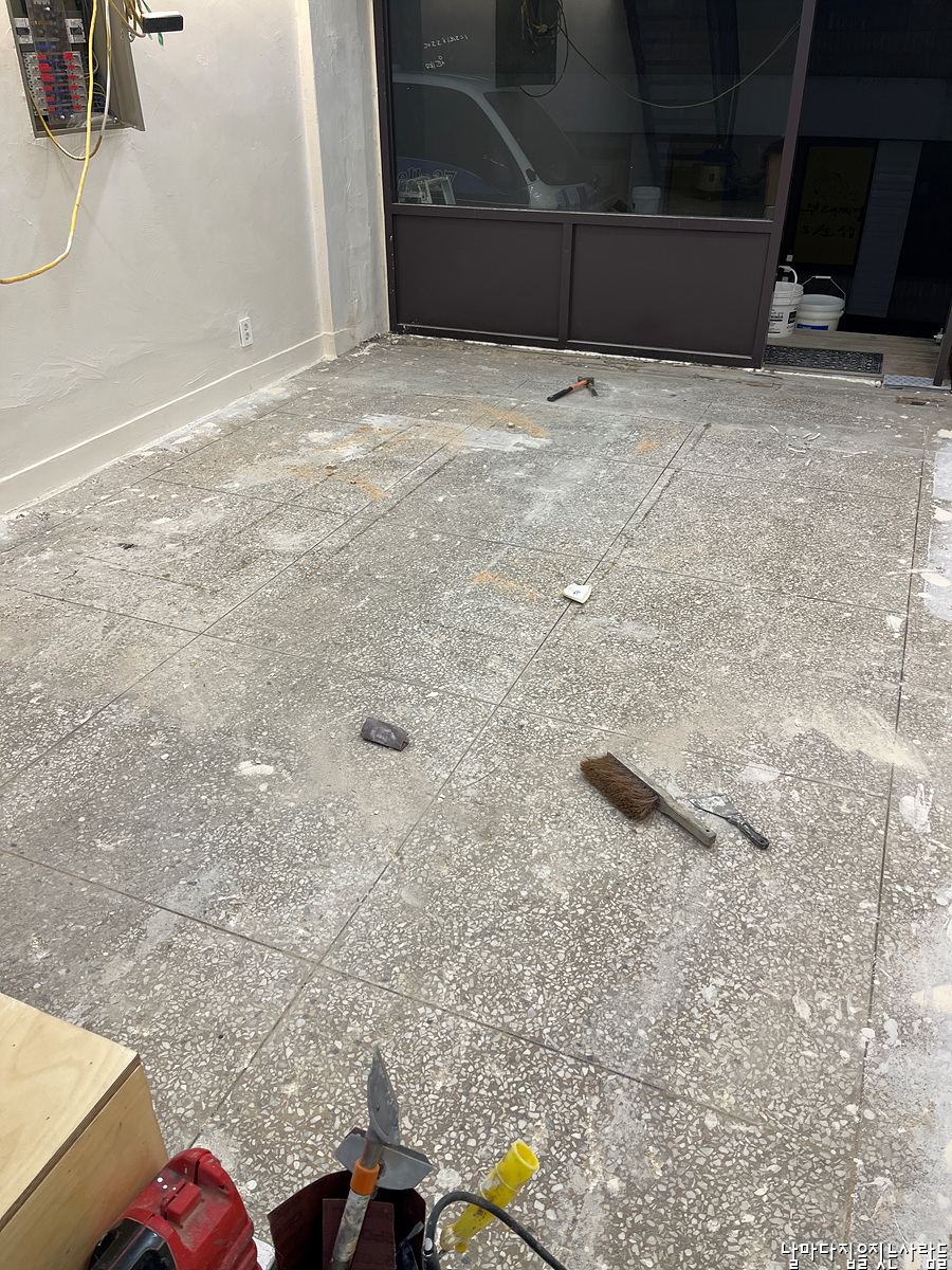 수평몰탈 작업 전 바닥청소를 진행합니다. 레브카페 바닥의 레벨차가 심해서 수평몰탈은 40mm용을 사용하였습니다.