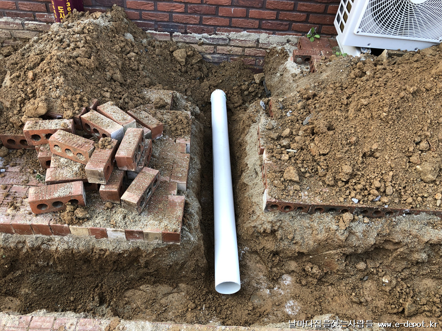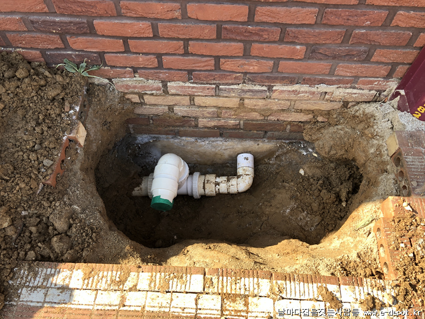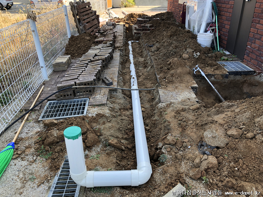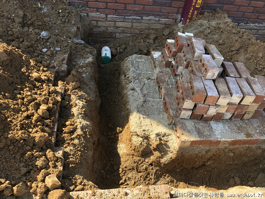 하수관이나 오수관의 구배를 고려하면서 부속건물방향으로 터파기를 하여 배관을 연결합니다.
