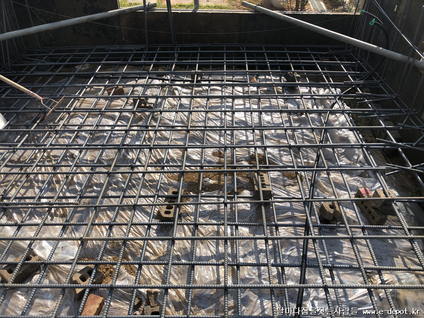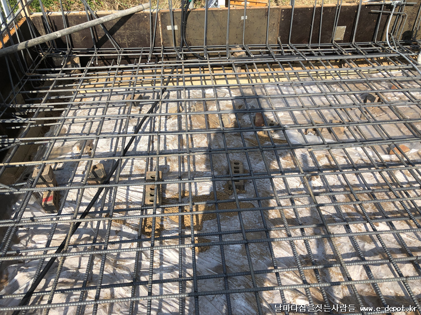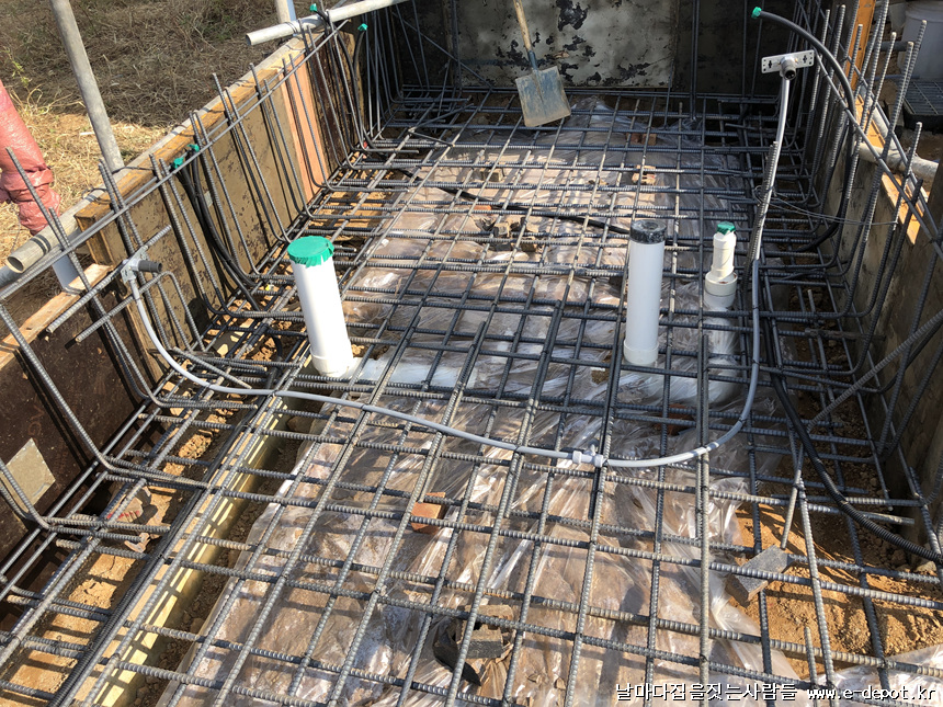 기초 철근배근을 한 후 배수관과 급수관의 배관작업과 전기배관작업이 마무리 된 사진입니다.
