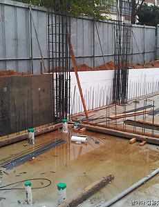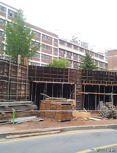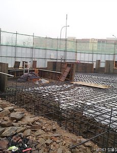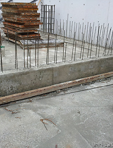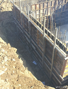 주택신축,상가주택,농가주택,전원주택 집짓기 : 상가주택 레미콘타설 및 거푸집조성 1차거푸집조성작업이 마무리 되어 바로 콘크리트타설을 진행하였습니다. 합벽부위는 솔져대신 서포트를 이용하여 보강을 하였습니다. 기초 타설시 22mm 철근을 수직으로 미리 심어 지지대로 사용합니다. 합벽의 경우 후레타이 사용이 불가하므로 토류판에 반생걸이(화살촉)을 이용하는데 화살촉과 반생에만 100% 의존하는것은 위험합니다. 그러므로 반대쪽에 보강이 꼭 필요한것이죠.. 이때 주로 사용하는것이 솔져인데 이번경우에는 서포트로 그 역할을 대신하였습니다. 솔져든 서포트가 되었든 모든 지지대는 유격없이 꼼꼼히 고정해주어야 안전합니다. 콘크리트 타설후 쉼없이 2차 옹벽거푸집조성을 진행하였습니다. 주택신축,전원주택,농가주택,상가주택,RC조..
