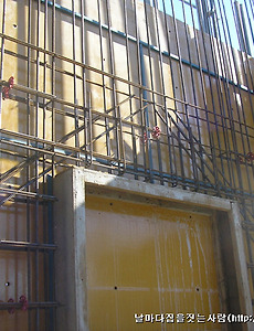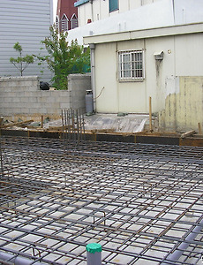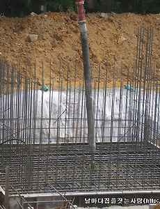 철근콘크리트공사 - 버림콘크리트 및 기초철근배근 기초 바닥고르기 작업이 지연되어 계획했던데로 포크레인 인양작업을 못하여 공정을 맞추기 위해 포크레인을 놔둔상태에서 버림콘크리트 타설을 하였습니다. 이튿날 아침 50톤 크레인으로 포크레인을 인양하고 바닥먹매김을 한 후 기초 철근배근을 시작,,, 바닥이 넓고 각진부분이 많은데다가 바닥 편차 있는부분이 2곳이나 있어 배근하는데 시간이 3일정도 소요될것 같네요 보통사람들은 작업자를 많이 투입하면 공정이 빨라질거라 생각하지만 무조건 작업자만 많다고 일이 빨라지는것은 절대 아닙니다. 일의 순서가 있고 절차가 있는것이므로,,,, 상황에 따라 작업자가 많이 필요할때도 있구요,, 작업자의 수를 조절하는것도 하나의 노하우죠,, 공사를 깊이있게 아는 분이라면 이해 하실수 있는..